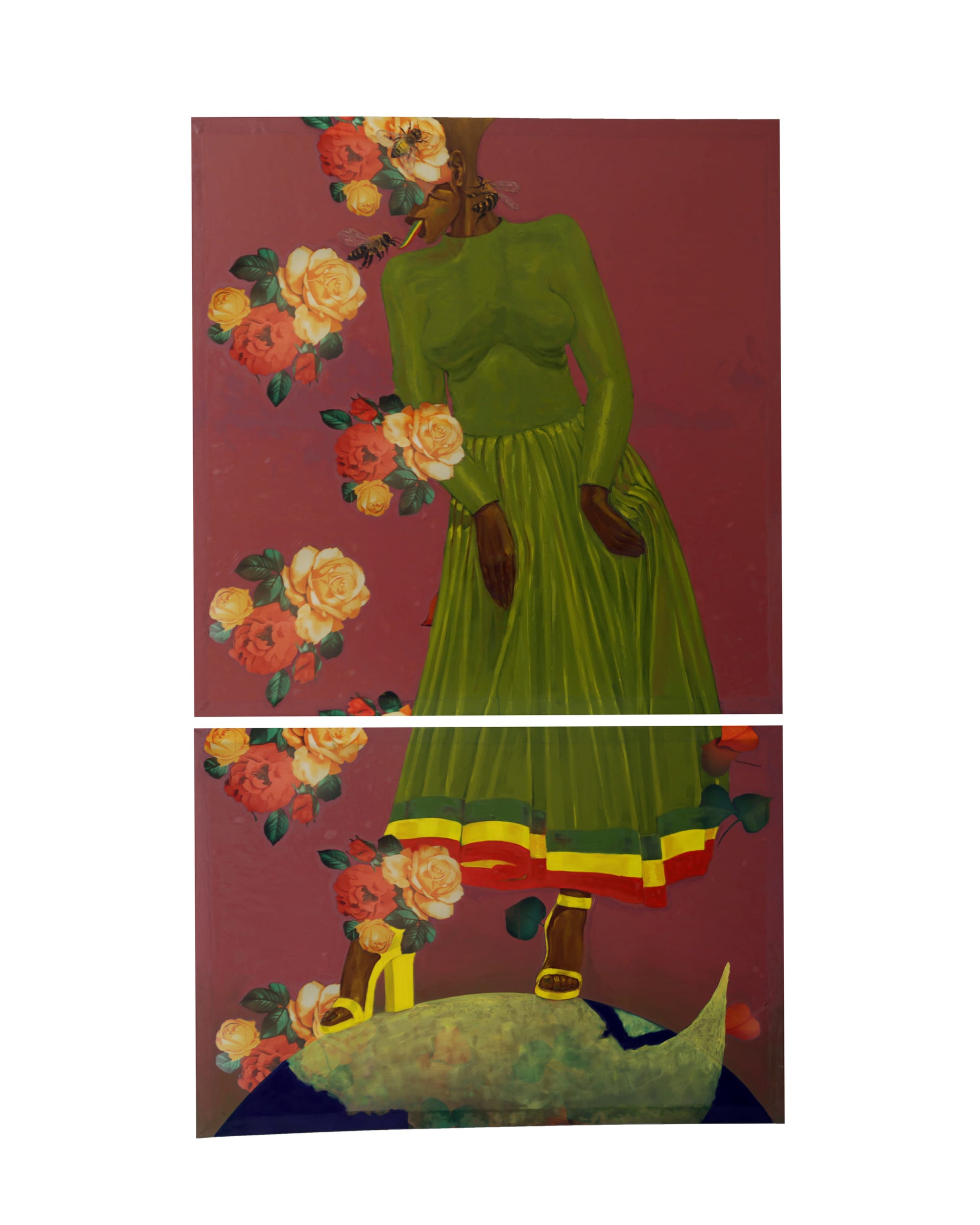 Godine depicts femininity as both earthly and divine. She expresses its power through abundance and beauty. In “Adwa (2)” (2020), white roses fill both vases adjacent to a woman dressed in a long white gown, maybe a bridal gown. Roses featuring prominently in the works. This expensive and expressive blossom has become one of the largest and most profitable industries in modern Ethiopia. The woman in “Substance in Space #1” (2021) stands on a globe, her bright yellow high-heeled sandals atop the outlines of Africa. She sways to the side as she gathers the skirt of her olive dress. Red and peach roses cascade down from her head. Her skirt is trimmed with the colors of the Ethiopian flag, which also color her tongue, sticking out to feed a bee. The image posits the woman as the source of nourishment for a country that is widely considered to be the cradle of humanity.
