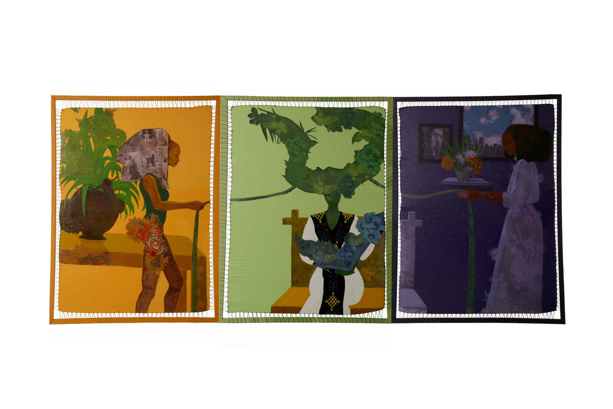 The triptych “Hair Salon in Addis Ababa #1” (2021) shows this trinity of nature, femininity, and culture in dialogue. In the left panel, a woman stands in front of a long table, on which sits a vase filled with decorative flowers and leaves. Her hair is composed of images of Empress Zewditu, the only empress in the history of Ethiopia to rule in her own right, ruling from 1916 to 1930. Braided vines connect this woman to the woman in the central panel, whose hair is an array of pine green flora that thrusts upward dramatically. She wears white religious vestments and holds a book teeming with plants. Another braid leads into the right pane, a more modern setting painted in an indigo hue; the panel’s chic vibe is matched by the woman’s cool smirk. A cityscape is visible through a window.