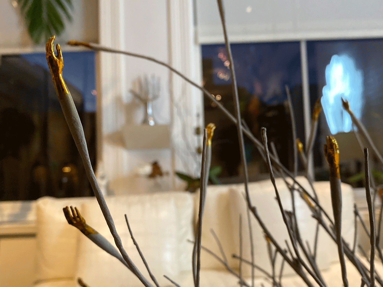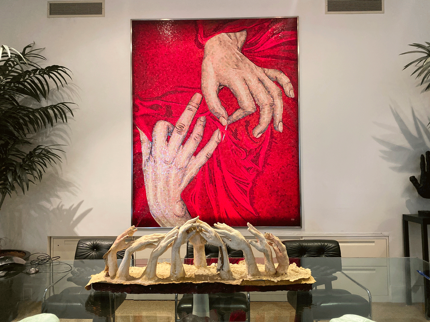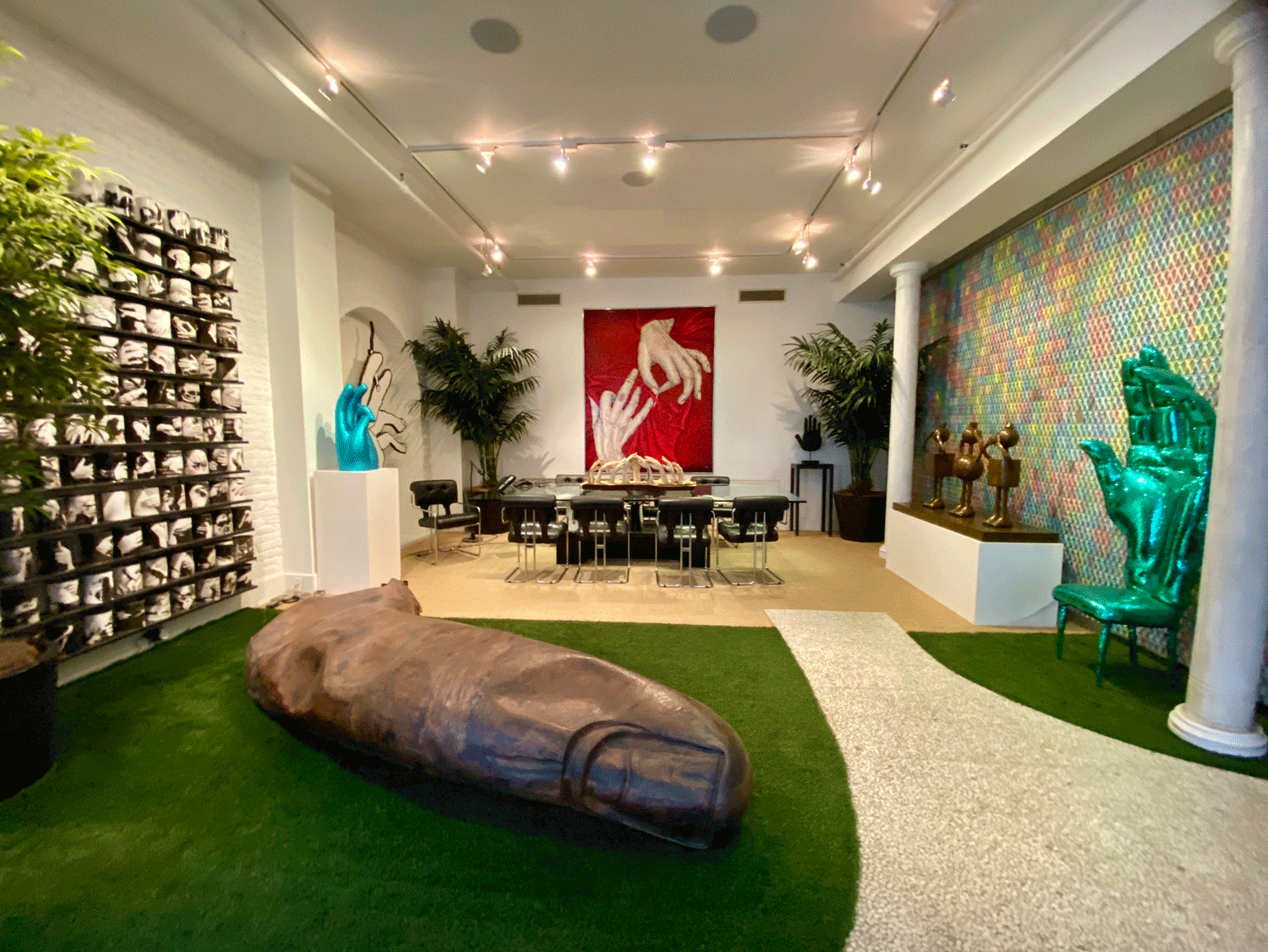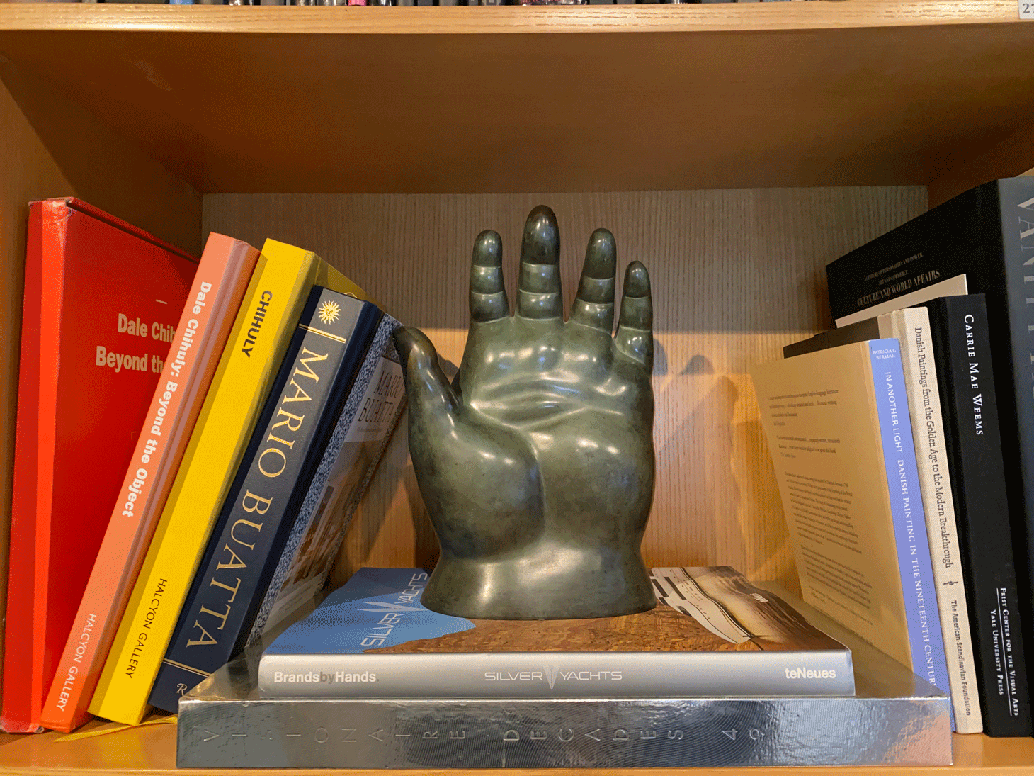 In another room of the house, between the living room and his office, Buhl created a “sculpture garden” carpeted with astroturf and decorated with potted plants, a fountain, and more hand artworks. It is there that Buhl shows the more contemporary works in his collection. Zhang Huan’s 10-feet-long “Buddha’s Finger” (2006) rests on the floor at the center of the room. The Chinese artist’s finger sculpture was made in protest against the destruction of cultural and religious assets in Tibet. Also in the “garden” are a chubby hand sculpture by Botero; Tom Otterness’s “Three Evils” (2002); a replica of Micheal Jackson’s iconic sequined glove; a hand-shaped chair; a hand-shaped bench; two tables held by hands; and many more.