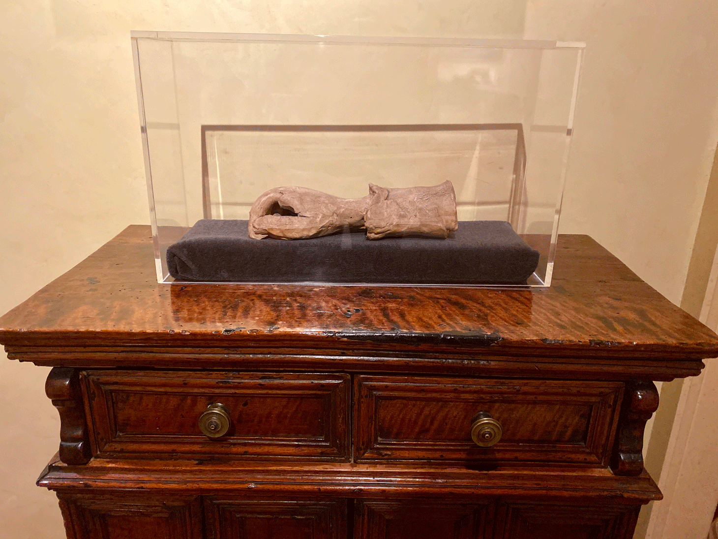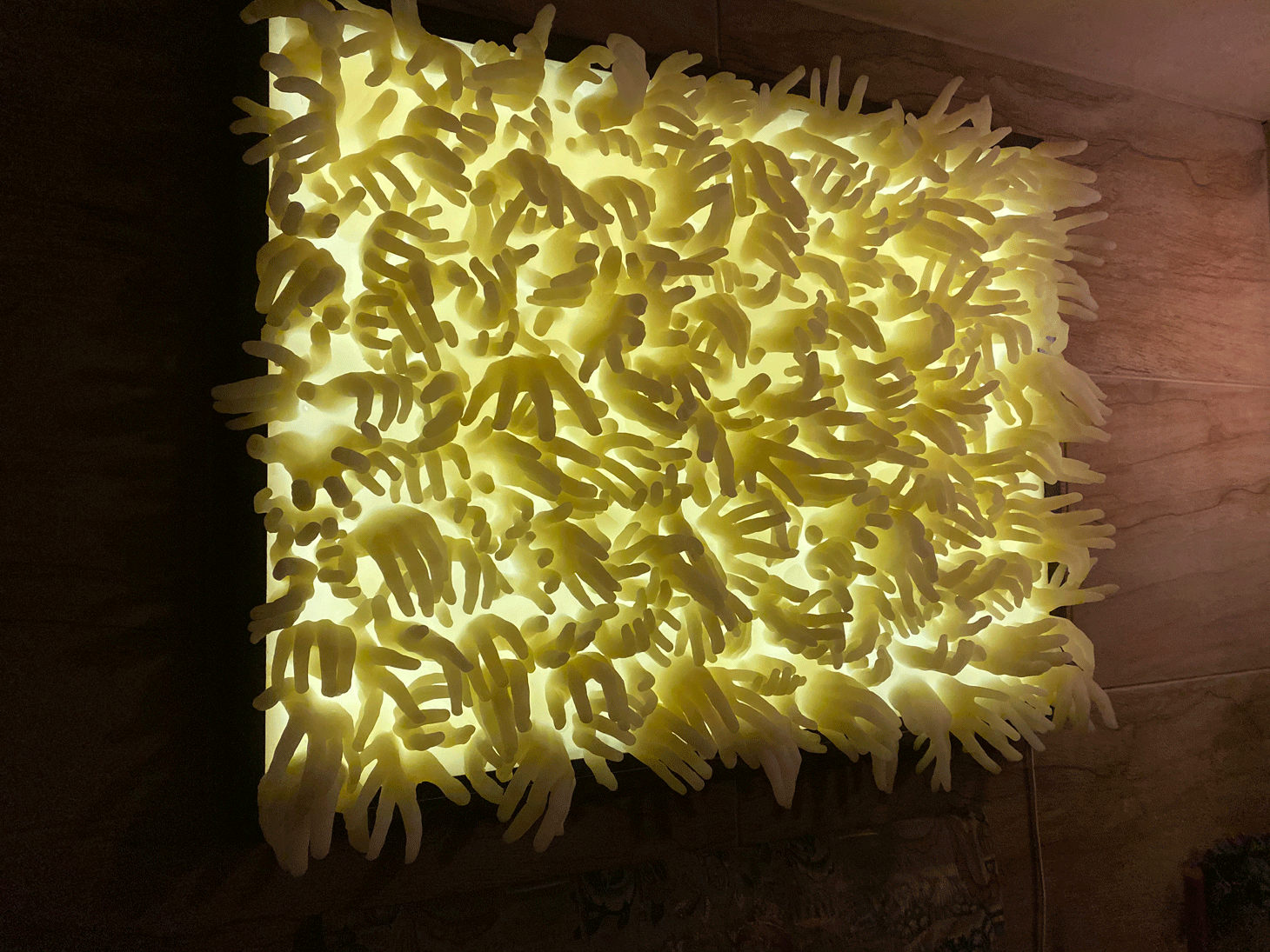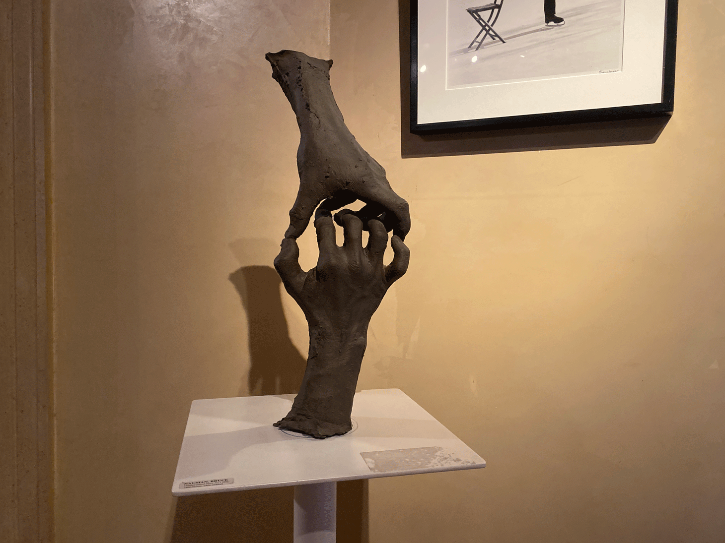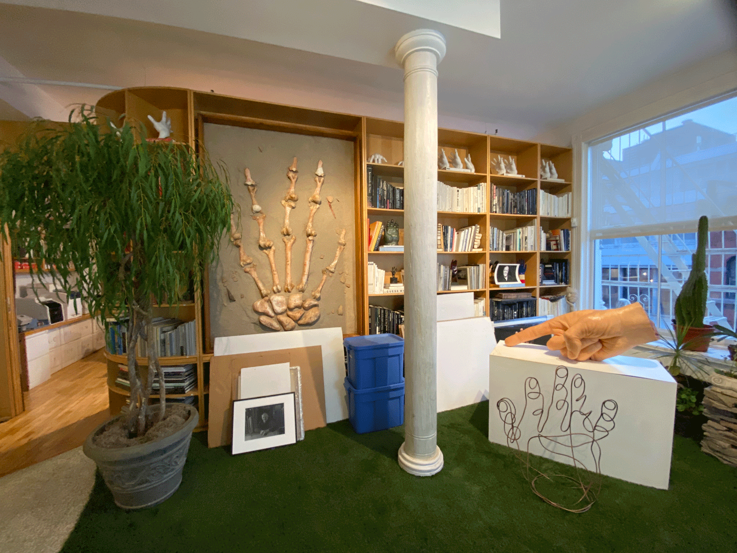 After a handshake, Buhl gave Hyperallergic a tour into his hand-filled loft. Next to the entrance is a luminous work by Alvin Booth, protruding scores of little white hands from a backlit rectangle on the wall. On a stand nearby there’s a Bruce Nauman bronze of a pair of hands delicately touching each other by the fingertips. Farther into this museum-like loft, a rare Picasso sculpture (one of two Picassos in the collection) made from varnished plaster lies inside a protective glass box.