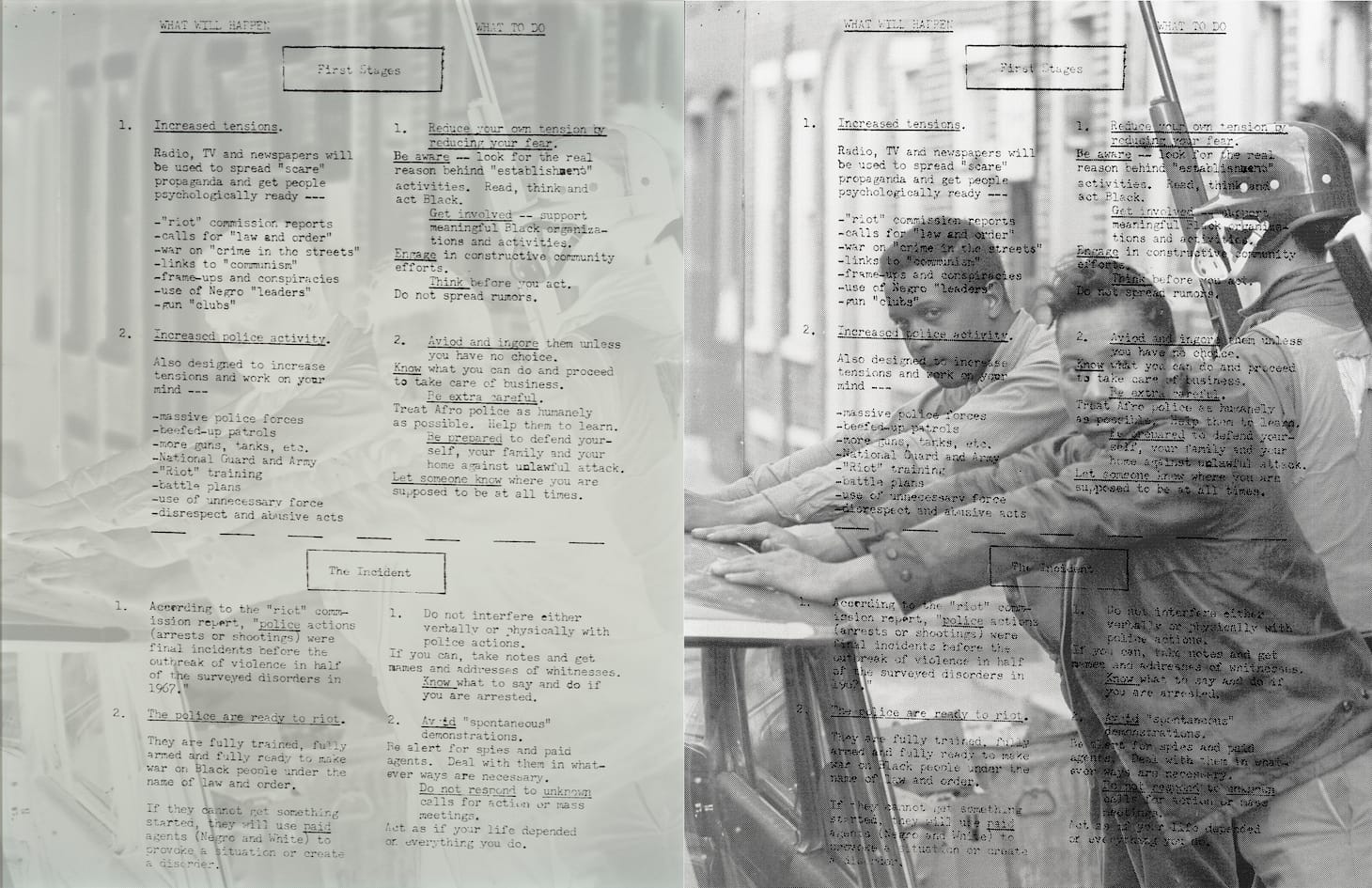 The context was it being the 50th anniversary of the longest occupation of federal troops in an American city since the Civil War, after the assassination of Martin Luther King. So we went to the [Delaware] Historical Society to find images that we thought would be really good for that. We wound up in all these boxes and I pulled out this thing that said “Black Survival Guide” and I was like, what? What is that? It was literally a handbook on how to survive a police riot.