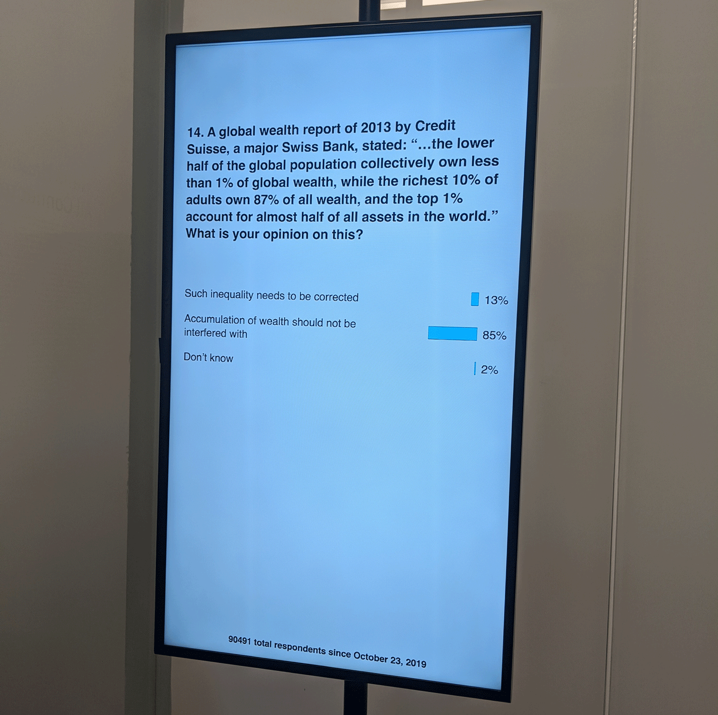 A question in the poll asks visitors to respond to the 2013 Credit Suisse global wealth report, according to which “the lower half of the global population collectively owns less than 1% of global wealth, while the richest 10% of adults own 87% of all wealth, and the top 1% account for almost half of all assets in the world.”