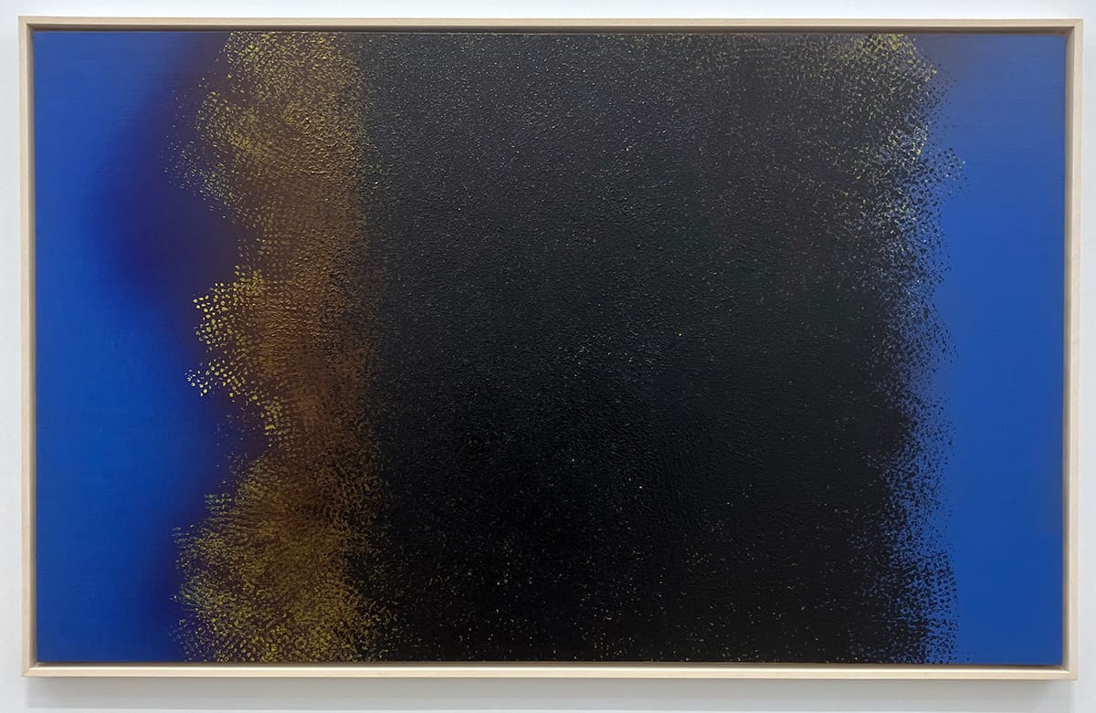 Thankfully, for the second time since their opening in New York, Perrotin has ignored the zeitgeist and devoted all three floors to this eccentric and deserving artist, whose work came from childhood drawings executed to ward off fear during lightning storms, the music of Bach, and the paintings of Rembrandt. The third-floor hanging that reprises the installation and sequential hanging of works in The Met exhibition is particularly revelatory. The filmic element is present in Hartung’s utilization of the rectangle to radically crop the abstract images. In the deceptively simple “T1974-R26” (1974) for example, a membranous white band made with a wide brayer diagonally bisects the blue background. Bending to its right is a slightly wider, thickly brushed yellow stripe. The ground reveals that it has black underpainting, and its blue overpainting is striated horizontally to the right of the two bands and vertically on the left of them. In all, an intensely knit together pictorial paint structure. One can detect underpainting and revision throughout the exhibition. Amid these seemingly sadistic, moody, and rumbling works that are at once calculated and free, Hartung preferred a clarified edge, even in his gatherings of rapid scratches into the surface, the visual equivalent of the sound of fingernails on a blackboard, but who else has done that?