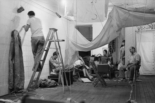 There are photos of “Words,” Kaprow’s September 1962 performance at Smolin gallery that used two continual rolls of cloth with words from poems, newspapers, comic and telephone books. The audience was asked to tear off the words, staple them together, write notes, even attack and hack them. It was the first time this form of audience participation was ever presented in an art gallery context.