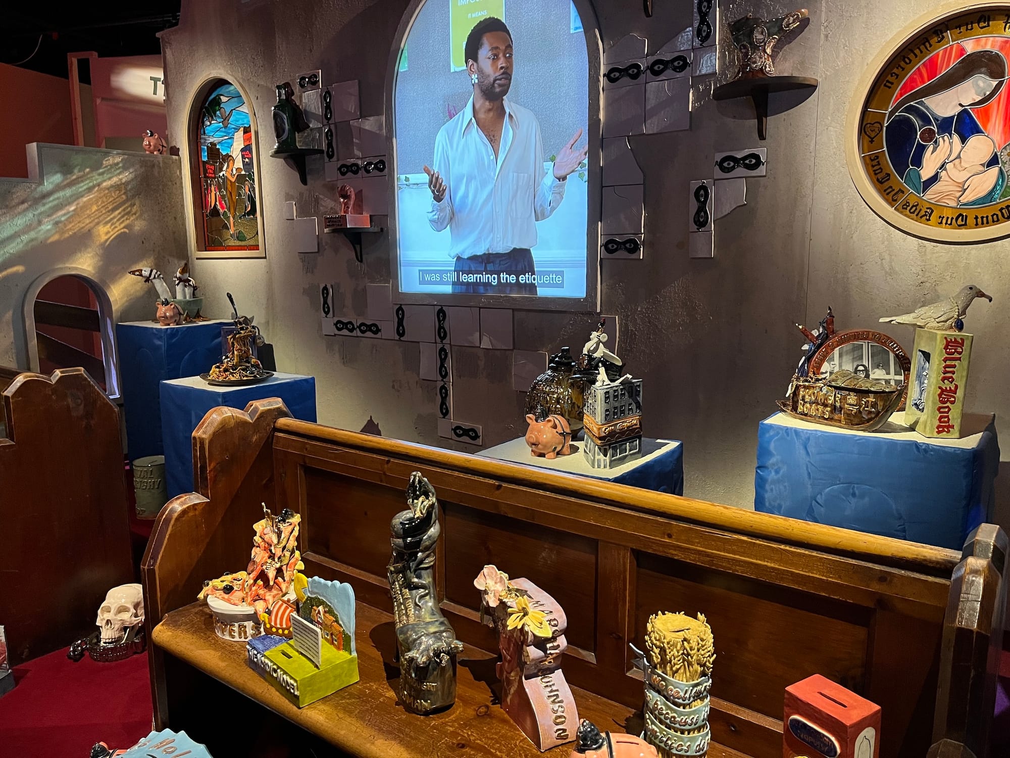 Despite the grit and realism of these pieces, Hard Graft does not lack imagination. Money Makes The World Go Round (2024) pulls together dozens of ceramic works, piggy banks, and a stage-like cathedral setting that references historic church occupations led by sex workers in 1975 and 1982. In an arched window where you might expect to find stained glass, nonbinary actor and author Mendez appears on film to deliver a sermon recounting their arrival in London and drift into sex work, honoring the long history of the profession and the movement calling for rights and protections.