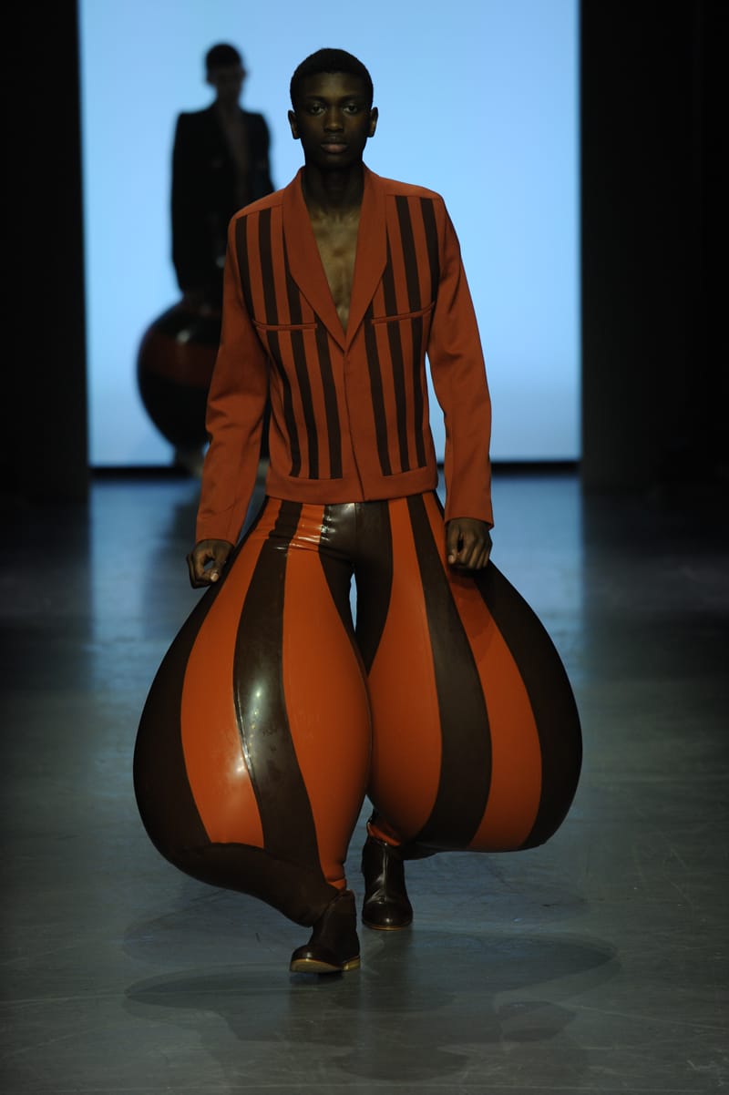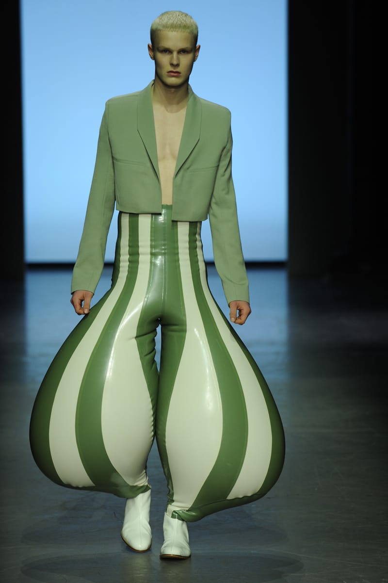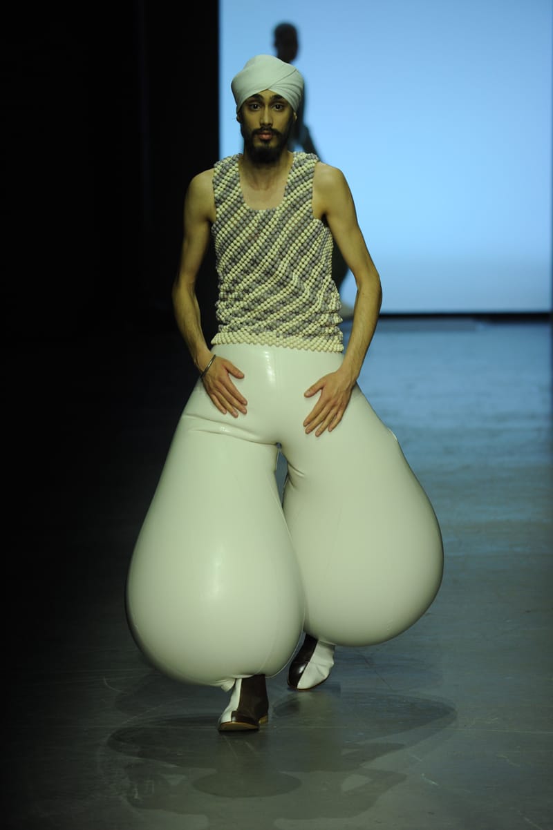 Menswear designer Harikrishnan sent models down the runway wearing cartoonishly inflated latex trousers — and they're brilliant.