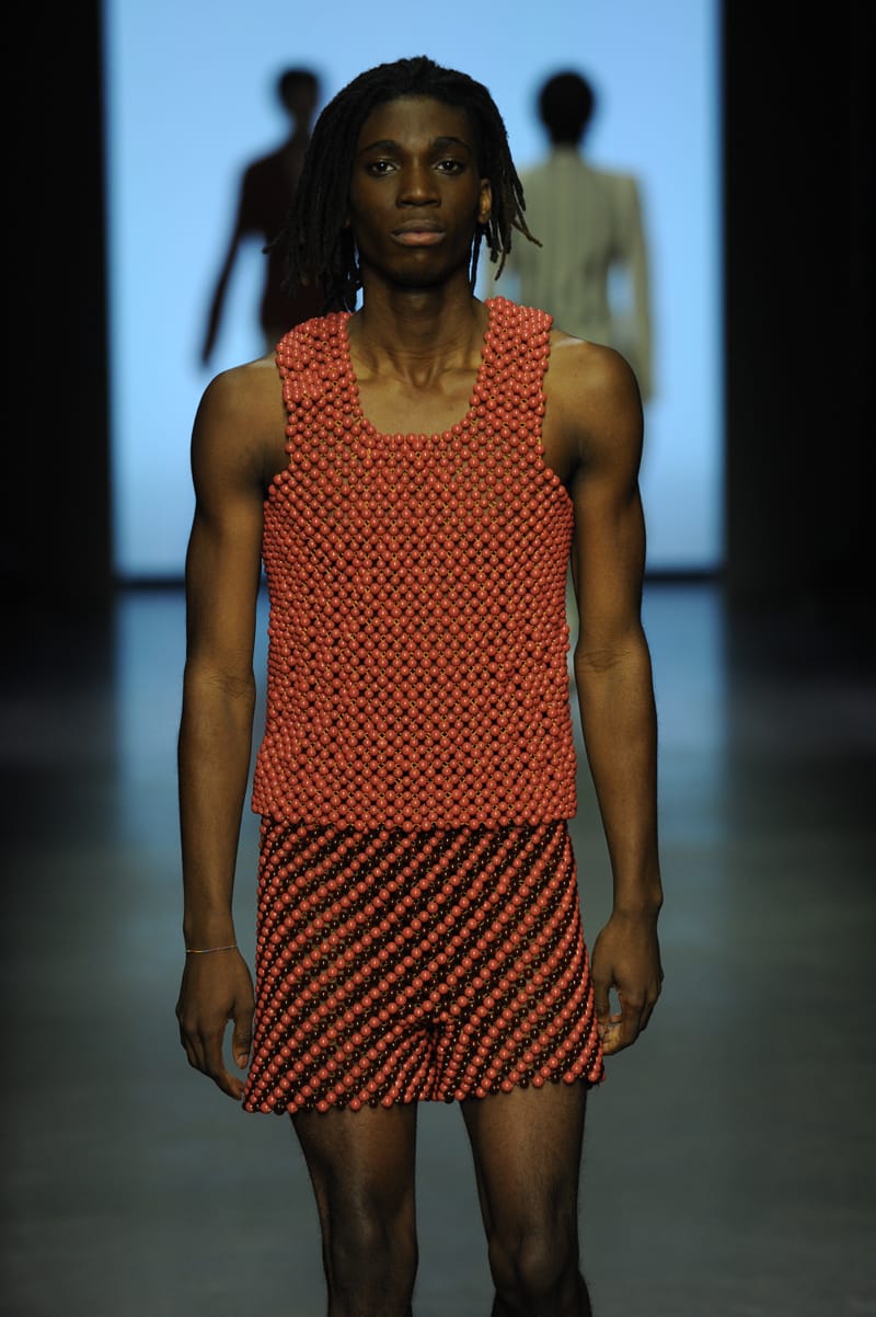 There is so much to like about these wacky silhouettes, whose clownish proportions are played up by stripy motifs in contrasting colors of green, red, and white. The looks are visually reminiscent of Oskar Schlemmer’s Bauhaus ballet costumes, with their exaggerated proportions and color-blocked panels. They also carry the same vibe as Alexander Girard’s wooden doll collection — perhaps as an aesthetic byproduct of the intensive fabrication process training undertaken by Harikrishnan in Channapatna, India, which is also famous for wooden and lacquerware toys that surely would have appealed to Girard’s folk art interests. In addition to the intensively paneled latex works, which were laid out in 3D models and then sectioned into panel pieces, Harikrishnan’s collection incorporates garments of woven wooden beads, generating fit and flexibility from a material not typically associated as a garment base.