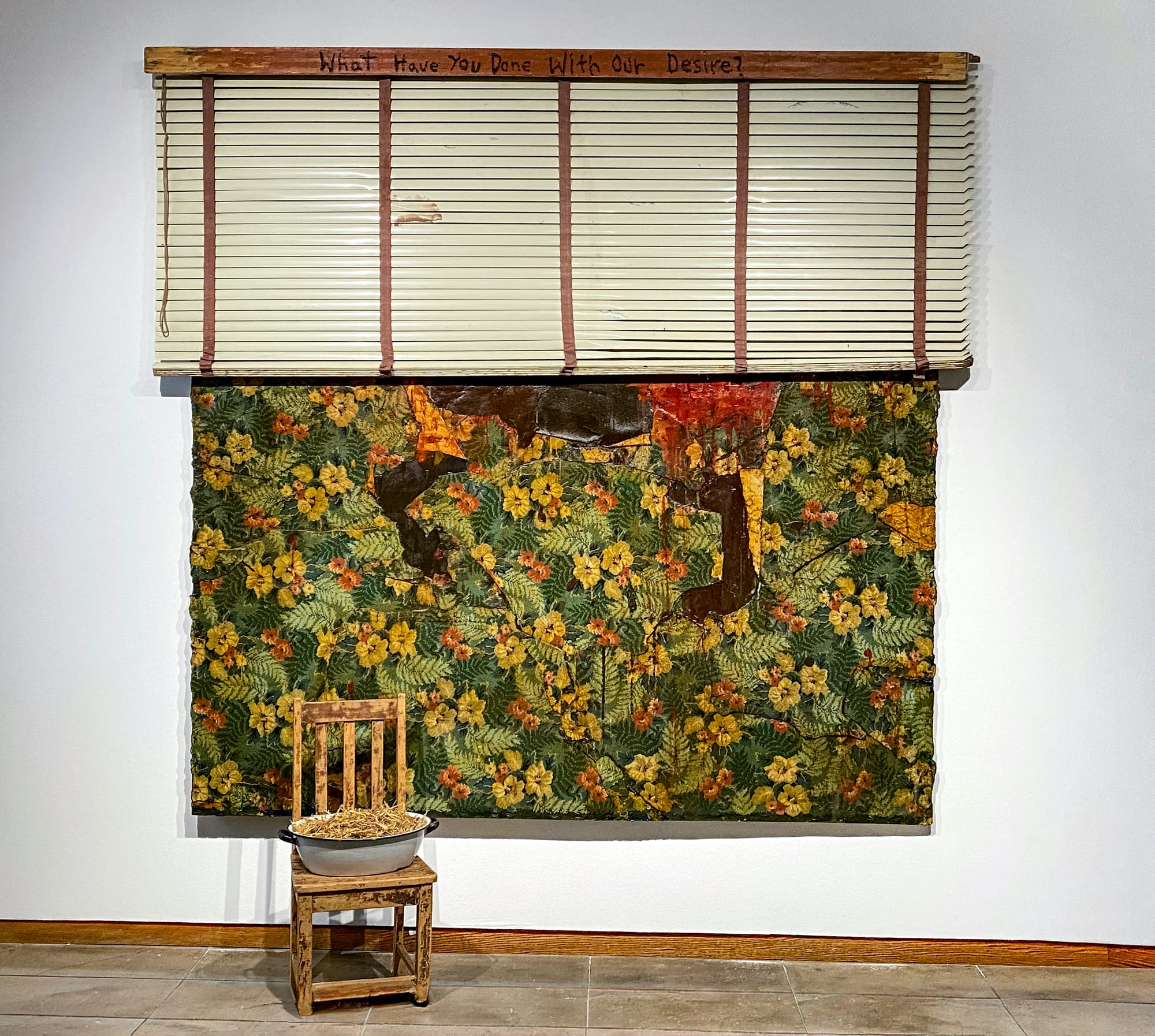 I also make overtly political work such as “Speaking Braids” (2001–02) or “A Queer Reader” (2003) that intentionally deal with 2SLGBTQIA+ issues such as voice, censorship, and historical erasure. The two types of work co-exist and influence each other. Once in a while they come together. I’m thinking of “What Have You Done With Our Desire?,” a mixed-media installation painting from 1997 that is currently included in Out West: Gay and Lesbian Artists in the Southwest 1900 – 1969, or “Voices I” (2023), a recent work. Both juxtapose fragments of vintage domestic-patterned linoleum with text by the French lesbian feminist theorist Monique Wittig to suggest both a physical and linguistic violence. She writes: “As lesbians we can well ask heterosexual society: what have you done with our desire? With desire itself?” And continues: “If desire could liberate itself, it would have nothing to do with the preliminary marking of sexes.”