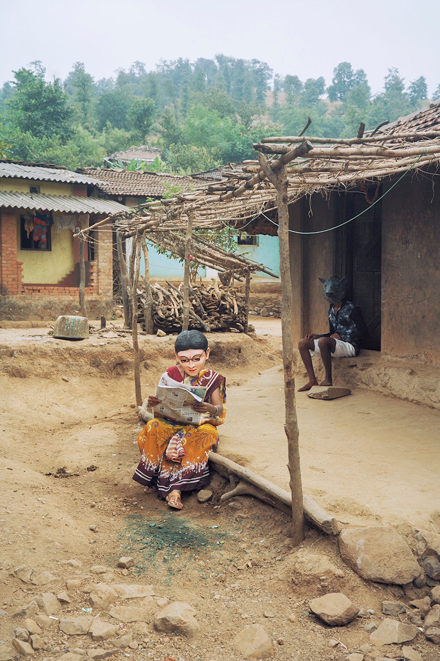 The act of concealing one’s face, or shrouding it in some way, confers anonymity, enabling a kind of inversion of normality and reason that still has the potential, as Oscar Wilde suggested, to reveal the truth. In Acts of Appearance, masks play a dramatic role, at times harnessing the revelatory power of allegory as a device to evidence social tensions and systemic failure. In a striking photograph, a Bespectacled Woman perches on the makeshift step of her hut, reading a newspaper. Her sandaled left foot protrudes from under the cloth of her sari. A splash of green pigment frames her upturned foot, reflecting the forest behind her. In the backdrop, slightly off to the right, a Bear Man prowls in the shadows. We instantly recognize this domestic tableau as a make-believe world, but the subtext of gender violence indicates a darker reality lurking behind the façade.
