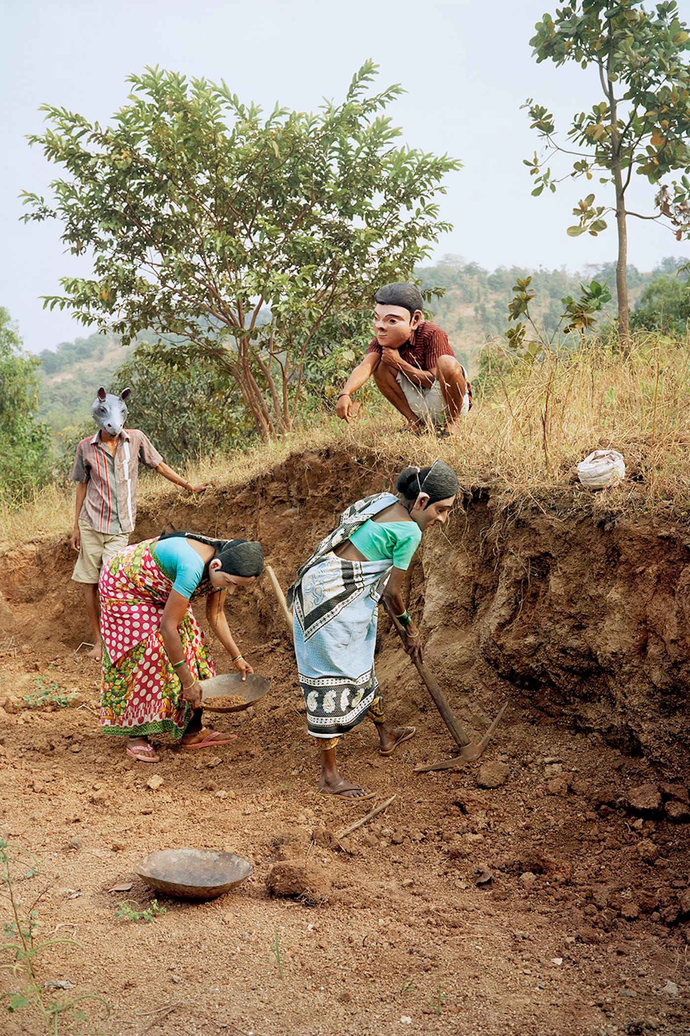 Another photograph nearby depicts four masked characters. A Donkey Man leans against a dirt mound, his left arm outstretched, angling up his left shoulder, while another masked figure with an inscrutable expression squats on top of the mound, a hand gesturing towards a pair of women below. This apparently anecdotal scene is an implication of the National Rural Employment Guarantee Act, a government scheme intended to provide wages for work to the rural poor. In this context, we read the actor seeming to hover on high as a contractor or government agent, a symbol of class exploitation — an interpretation corroborated by the presence of the Donkey Man. In practice, in Indian society, those on the lowest social rung, like the Adivasis, are accorded less value than beasts. It’s a sharp critique of a system that has been built on the edifice of economic slavery.