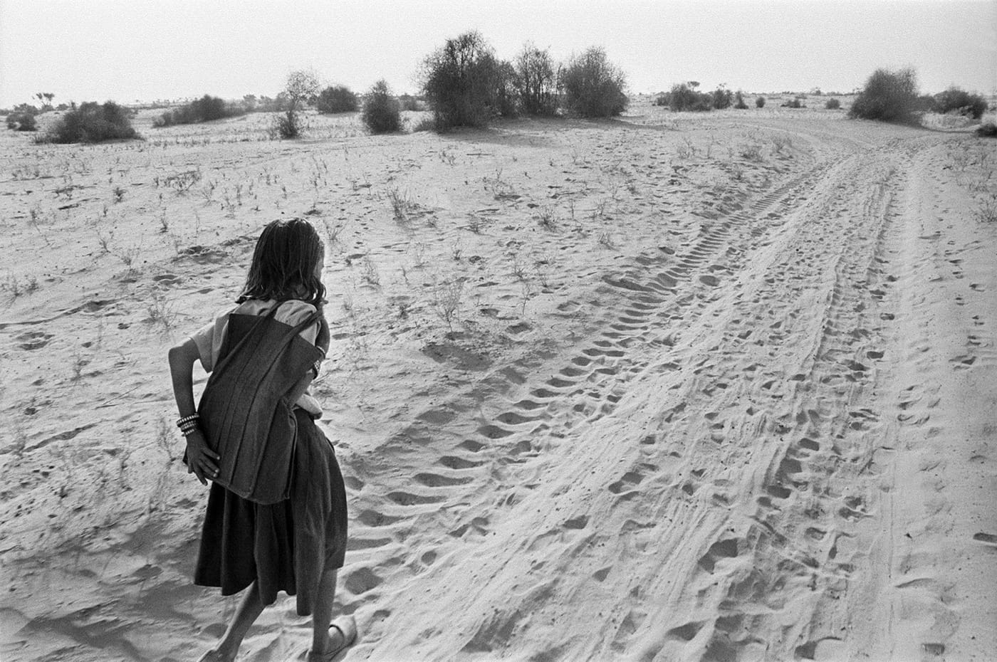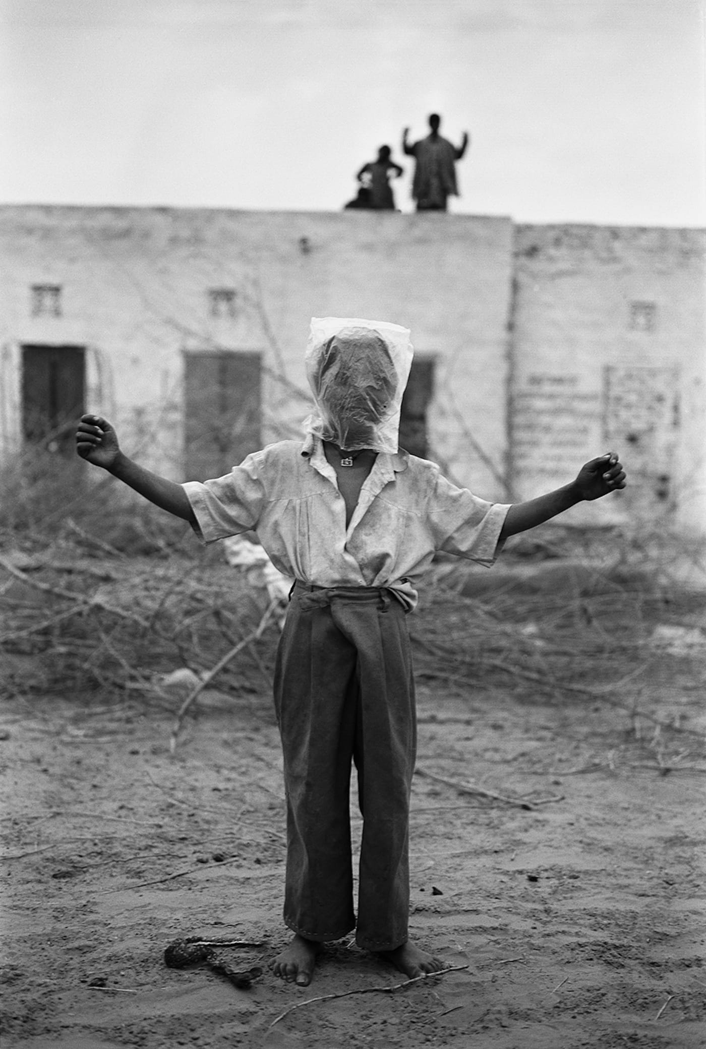In “Jogiyon ka Dera” from Notes from the Desert, a young, barefoot boy with arms outstretched, stands on the hot, baked earth. A dusty plastic bag covers his head, the expression on his face a grin or a grimace, rendering him a living corpse. The assertion of vulnerability, and Christ-like stance, are reminiscent of a diabolical, Brueghelian caricature. He’s fooling around (and undoubtedly, posing for the camera), but it’s clear that the games children play in such places are darker than elsewhere, a reflection of their grim lives, but also a welcome reminder that even within bleakness, there are moments of spiritedness and play.