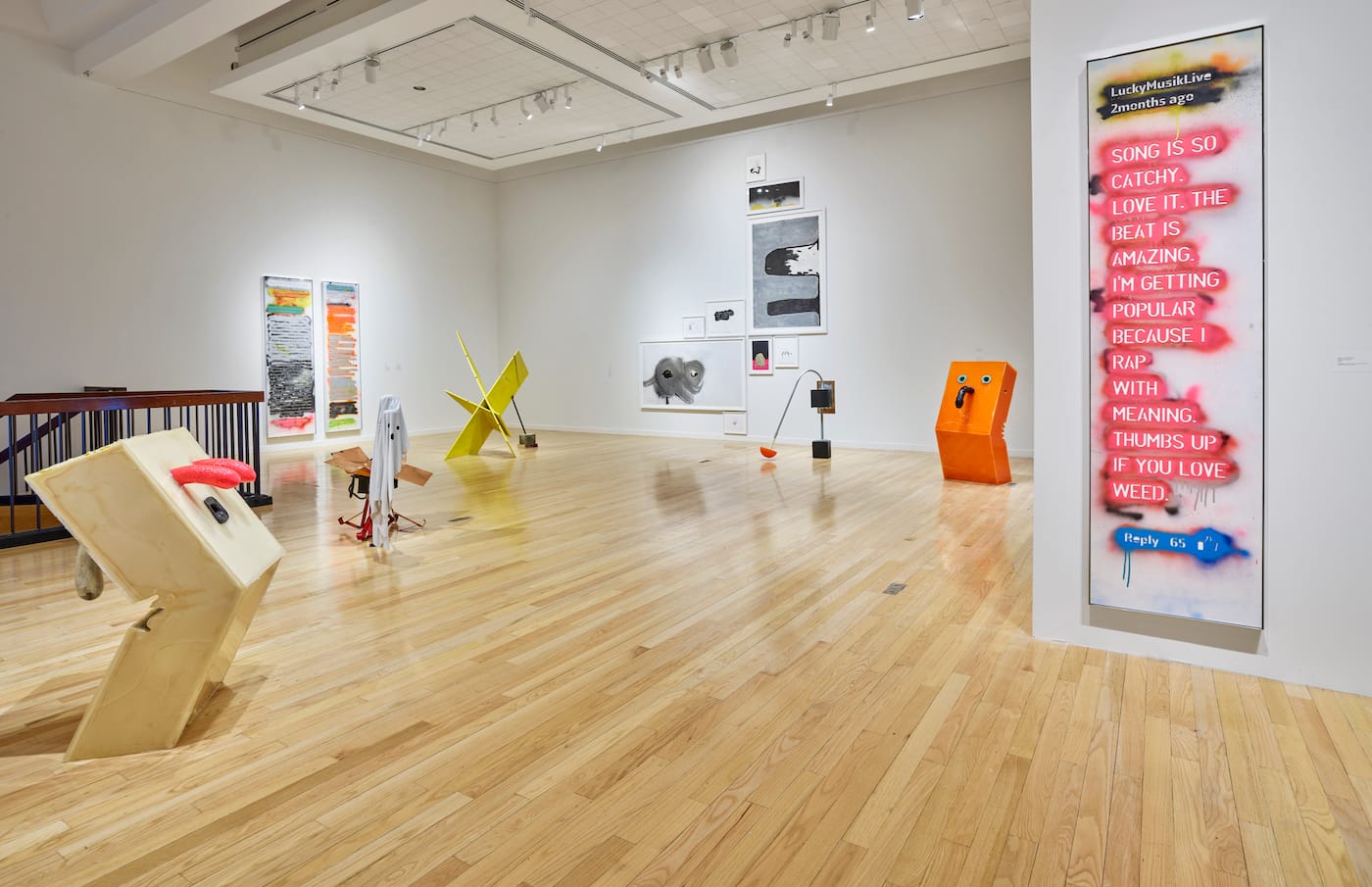 And in fact, the use of Play Doh™ — and play in general — is key to the work presented here at the Tufts University Art Gallery. There is Play Doh™ and there are masks; Dodge wears a smiling cardboard box on his head in “Big Bang (Song of the Cosmic Hobo)” (2016). And in “Mysterious Fires (2016),” Cay Castagnetto sticks fingers in the ears of a rubber mask and wiggles them around to make it look trippy and ridiculous while saying very serious things. These details, and the inescapable fact that “Fuck Me/Who’s Sorry Now,” “In This Hole/Honey Bucket,” and “Sickly Abstractions/Original Concrete” (all 2015) look like cousins of SpongeBob SquarePants™, are all key here.