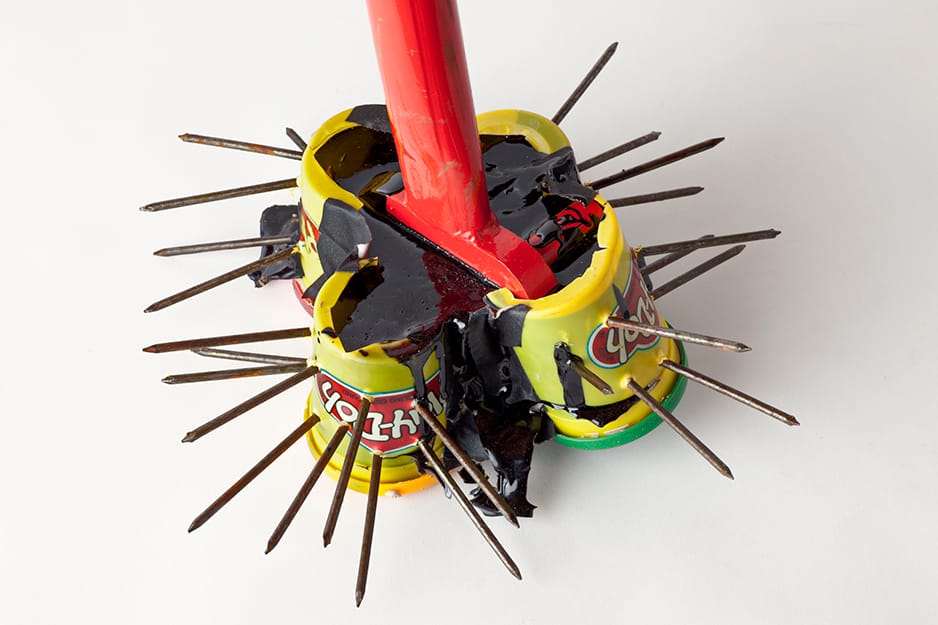 MEDFORD, Mass. — Let’s start with “Emergency Weapons” (2002–17). This collection of pointy, gooey, hastily assembled objects originated out of a drill that artist Harry Dodge invented: Your government has been taken over by an angry mob that is particularly hostile to people like you. It’s past the point of taking to the streets to protest. The streets are now full of people who feel fully empowered to seek out and destroy people like you. You can hear them, they are coming down your street, and now trying to break down your front door. Look around you: What are your options for protecting yourself and your loved ones?