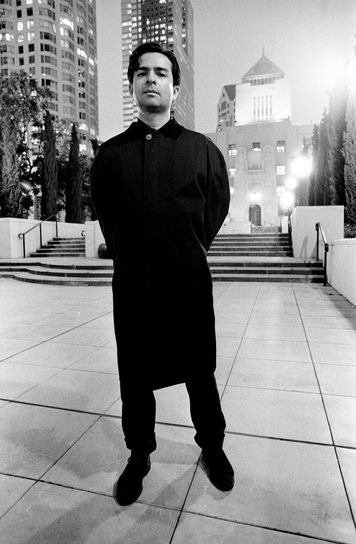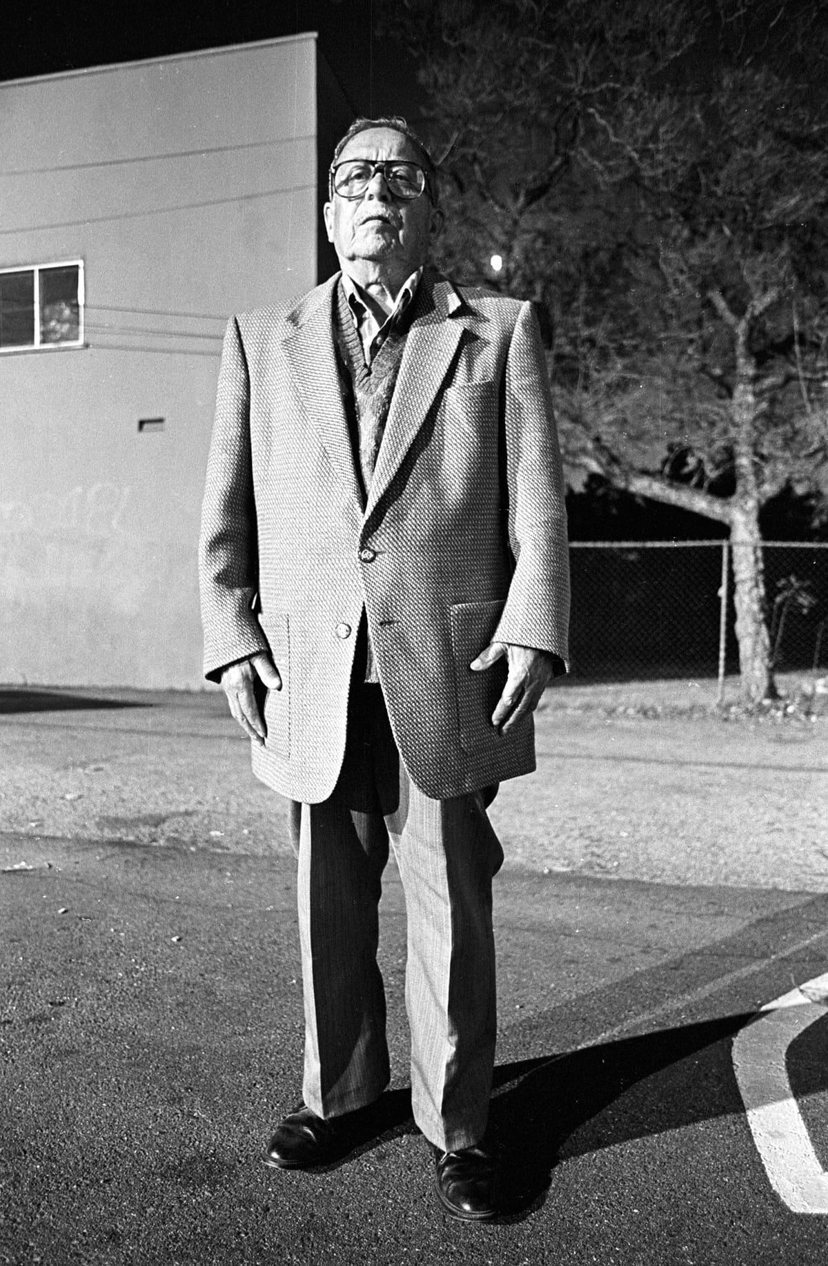 In “Jack Vargas, Librarian” (1995), Vargas stands tall on the patio of the Central Library, hands held behind his back but leaning ever so slightly forward, as if sliding into a comfortable new groove or balance. Vargas wears a long, black coat with a single shiny top button that cuts a stark silhouette in the grainy dusk. His face is good natured; a loose quiff has fallen to meet his eyebrow, and he meets our gaze confidently and almost a little amused, as if he knows a joke we don’t. The library’s lights blur white in the background, and Vargas’s shadow splits and doubles faintly at his feet.