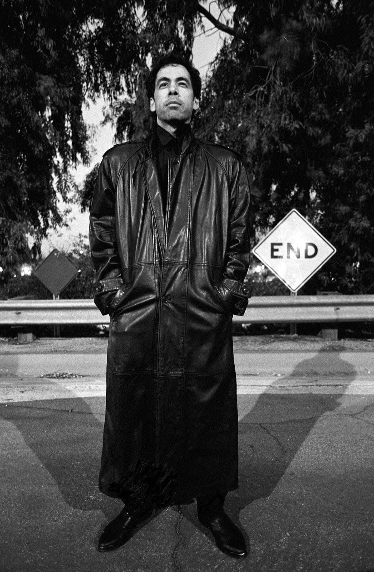 Shadows are pronounced in Chicano Male Unbonded, and heighten the shrouded but miraculous beauty of these men. In “Jesús ‘Chuy’ Torres, Poet/Performer” (1997), Torres’s shadow extends over the gravel in the street, and cuts across and defies the prescribed diagonals of a nearby fence; they act as anchors, or legs almost, planting this immigrant identity as one to stay. Torres wears an oversize polo pullover tucked into black jeans, bunched up and billowing at his wrists and waist — it’s a bit dramatic, with hints of a Regency-era ruffled shirt. His eyes squint, and he gazes at us with a cool determination, asking how we choose to identify him first: poet, performer, or Chicano?