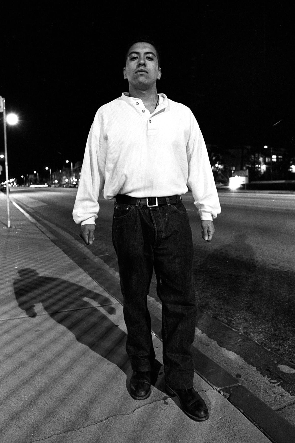 Torres stands on the curb next to a bus stop, the glossily painted fire lane bisecting the image diagonally and propelling him toward the viewer. In this and other portraits in the series, Gamboa photographs subjects in seemingly random, everyday parking lots and street corners. Such placement forces viewers to reckon with their irrational unease of “dangerous” Chicano males just walking home at night like everyone else, while also raising the larger question of how we decide, project, and police who belongs in which public spaces. At the same time, however, it almost doesn’t matter where each person stands. The background seems to fade as Gamboa closely collaborates with each subject to have him create and hold his own ground. That subjects still look so dynamic in mundane, unprepared settings speaks to how ready they are at any given moment, and how their identity is just a part of how they carry themselves. You almost want to step back, out of a mix of intimidation, respect, and awe.