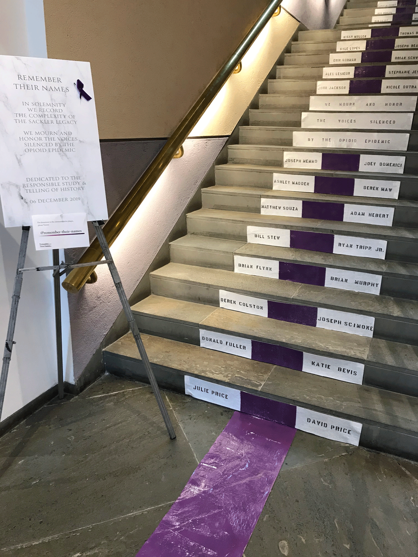 On the morning of last Friday, a group of students in the History of Art and Architecture department transformed the lobby of Harvard’s Arthur M. Sackler Museum into a memorial site dedicated to victims of the opioid crises in the Massachusetts area. Titled Remember Their Names, the installation featured the names of 250 people who died from opioid overdoses recorded on the museum’s stairs. A mock-up plaque with a black ribbon welcomed visitors to the museum with the text: “IN SOLEMNITY WE RECORD THE COMPLEXITY OF THE SACKLER LEGACY … WE MOURN AND HONOR THE VOICES SILENCED BY THE OPIOID EPIDEMIC.” The alternative plaque is modeled after an existing donor-recognition plaque dedicated to Arthur M. Sackler.