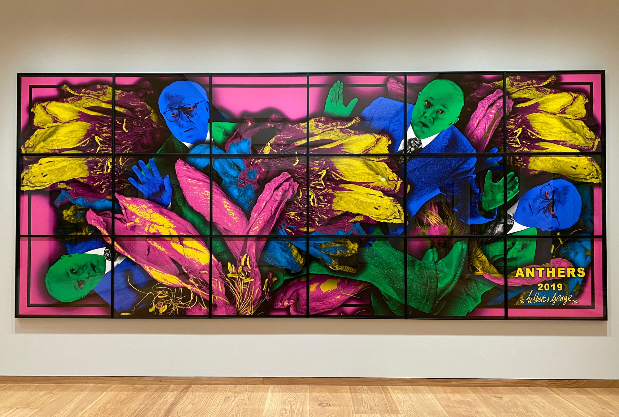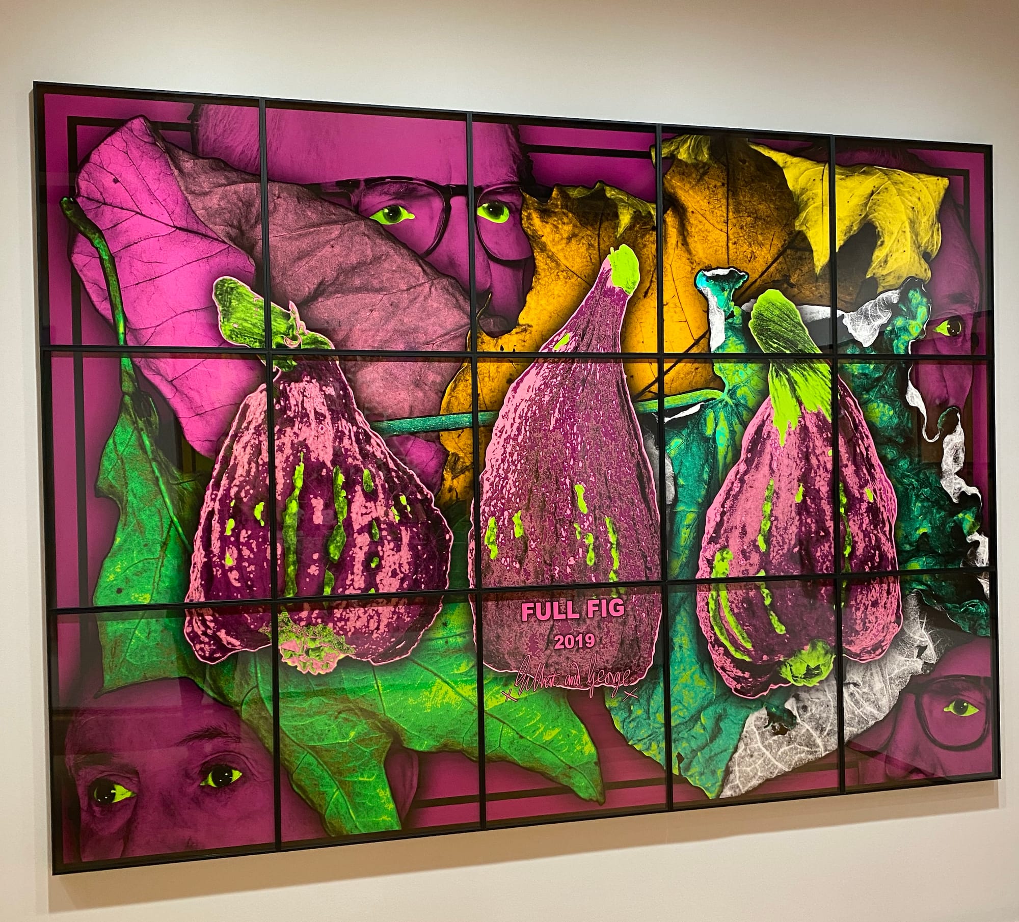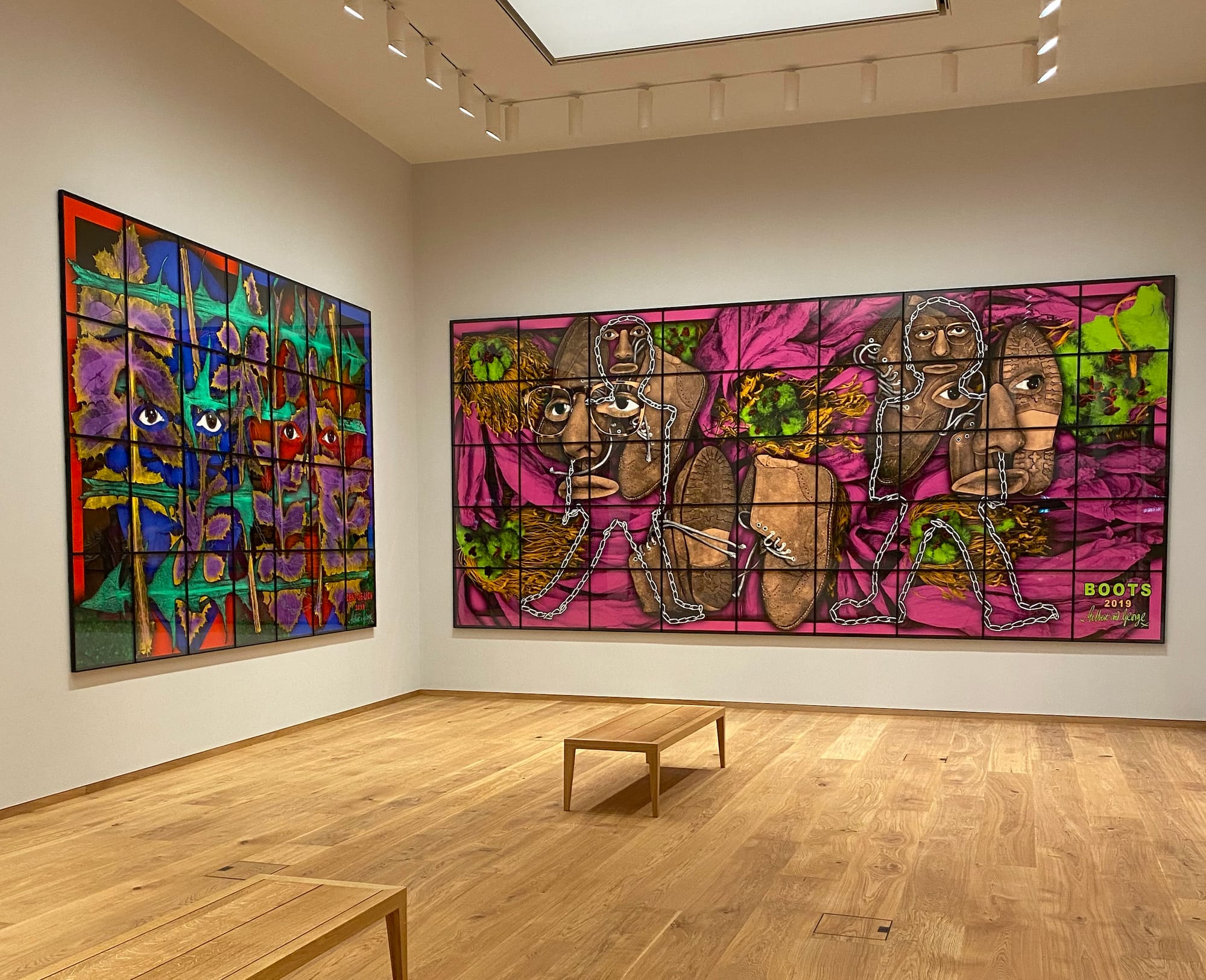 The title of the current exhibition is The Paradisical Pictures, but this is no paradise ever yet glimpsed by you or me. As so often in their art, the colors in these huge panels are shrill and almost hallucinogenic. The menacing force at work here is Nature in all her many manifestations, from warping mushrooms to veiny giants of leaves with bad skin as seen down the barrel of a microscope to wormily, strangulating tendrils. G & G are sometimes at the center of it all, orchestrating proceedings, and other times wholly, helplessly marginalized, swallowed up, reduced to the boggling, kohl-enhanced eyes of the incarcerated spy. In a work called “On the Bench” (2019), the artists have collapsed on a bench at the foot of a tree. To dust they will return, the gong resounds.