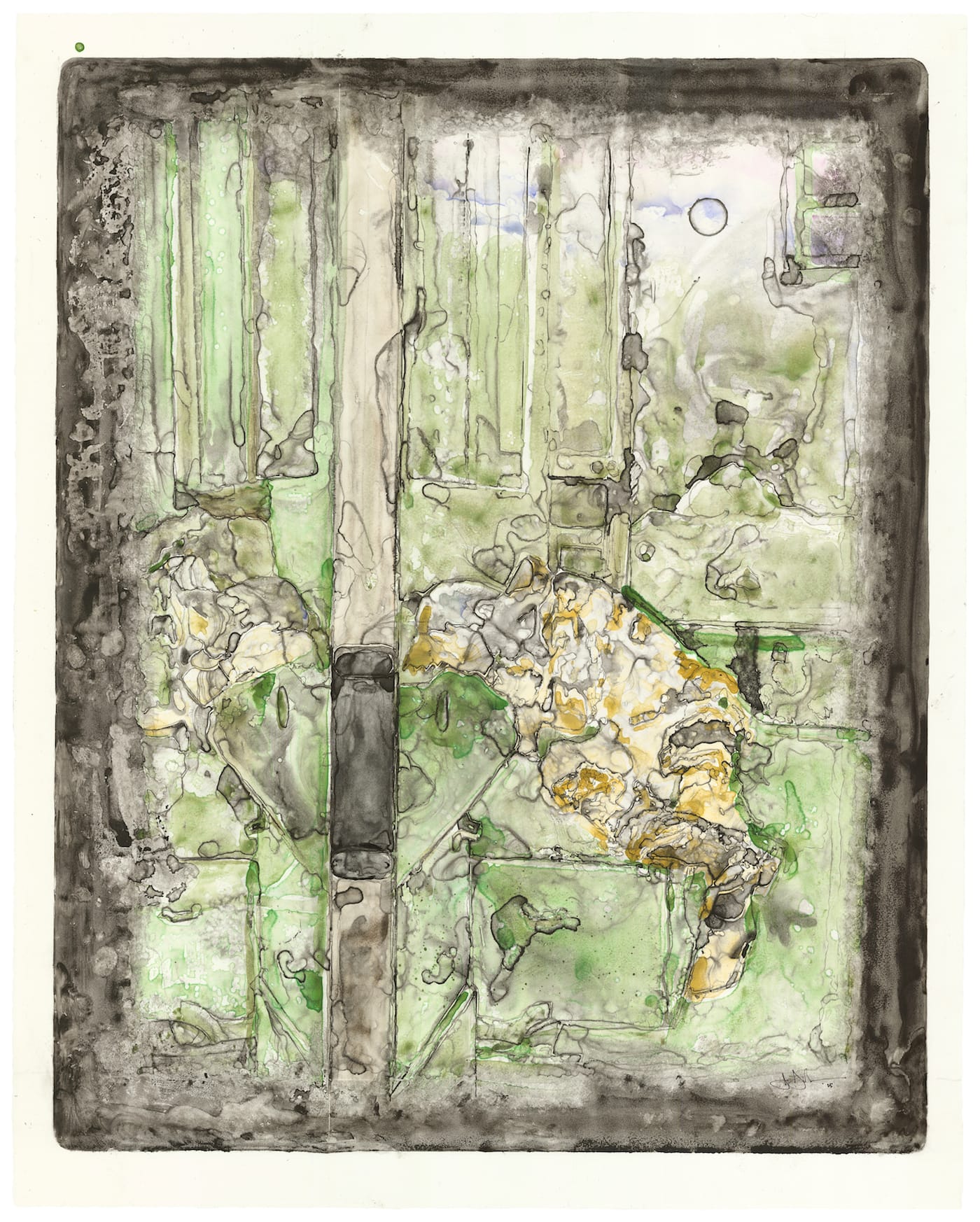 To revisit a word that Johns used in his interview with Bernstein, he is clearly “disturbed’ by the two photographs that he employs as source material in Regrets and in the three monotypes at Matthew Marks dated 2015: both bodies of work show a man with his face buried. One is sitting on a bed, while the other is collapsed on a trunk. As they cover their faces, both men tucked one leg under the other, their bodies twisted.