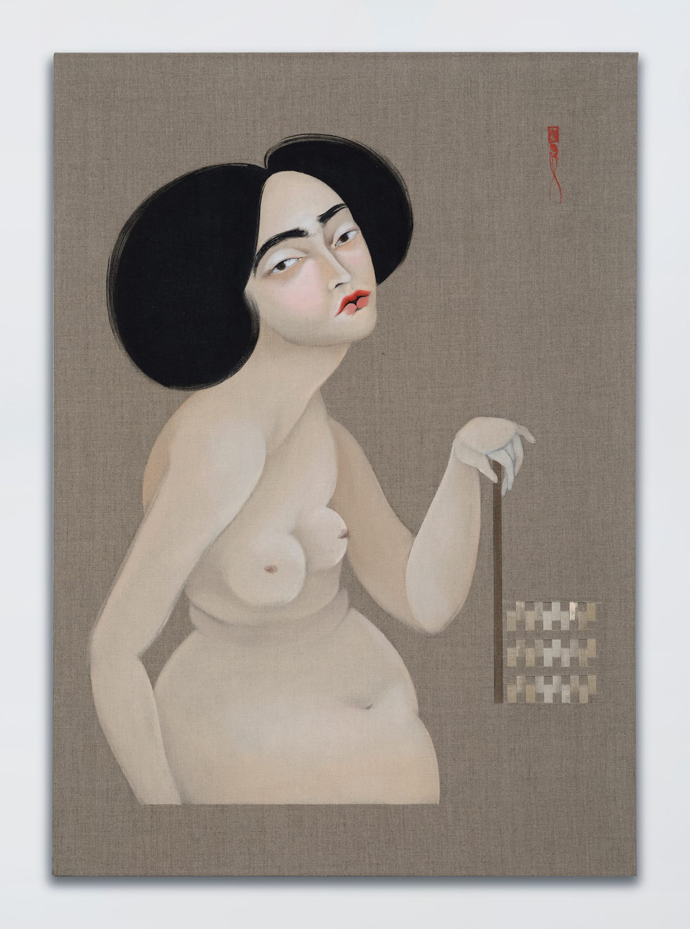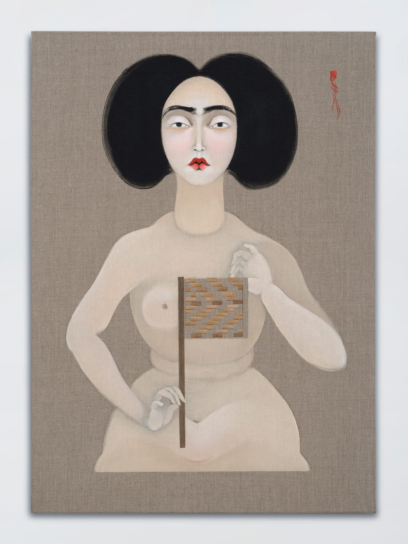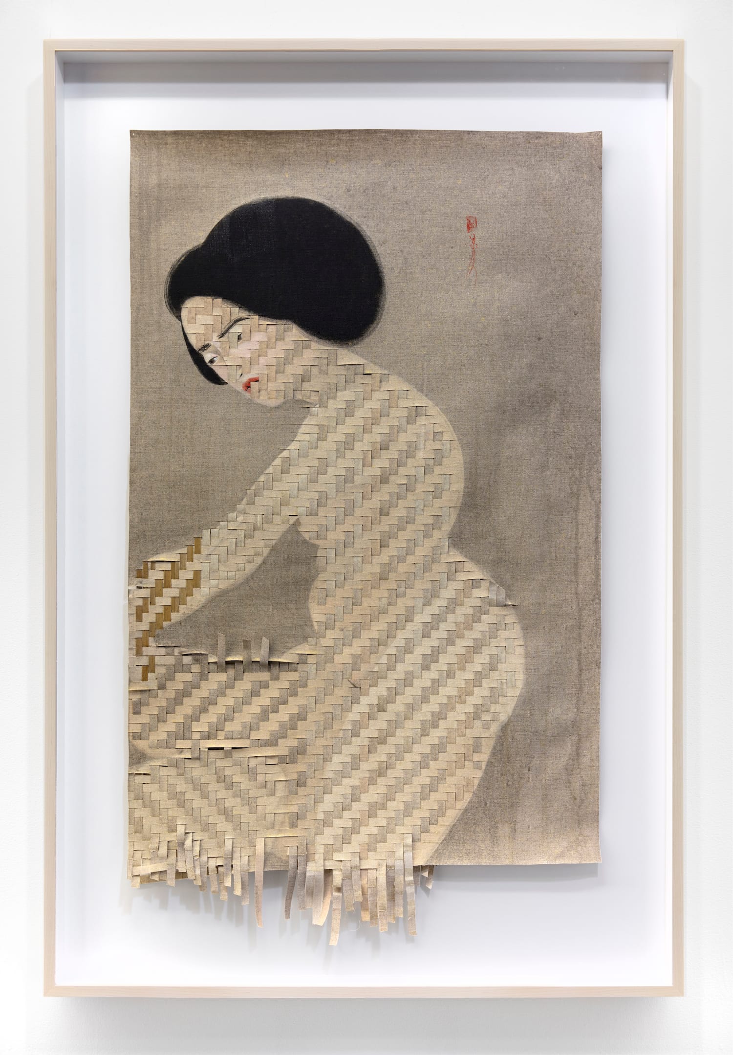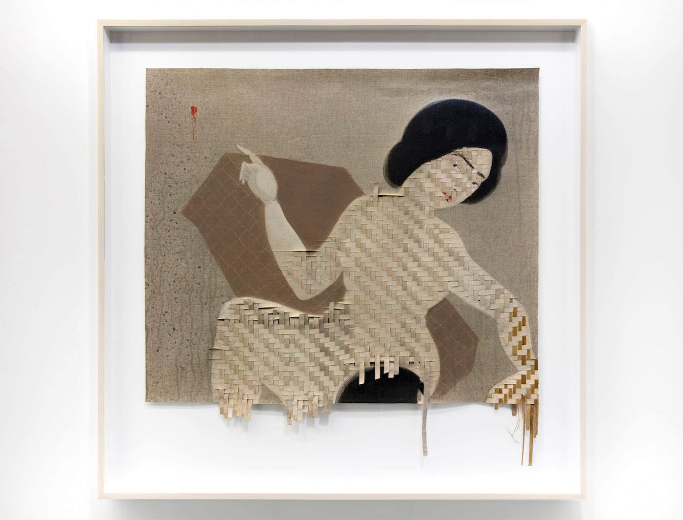 In Re-weaving Migrant Inscriptions, Kahraman’s third exhibition at Jack Shainman on West 24th Street, in Chelsea, the mahaffa forms the central motif in new paintings and collages that combine elegant self-portraits in oil paint with intricate geometric patterns formed by plain weaving techniques. The artist’s work embodies an autobiography of mnemonic fragments constructing a narrative of forced exile, displacement and cultural assimilation.