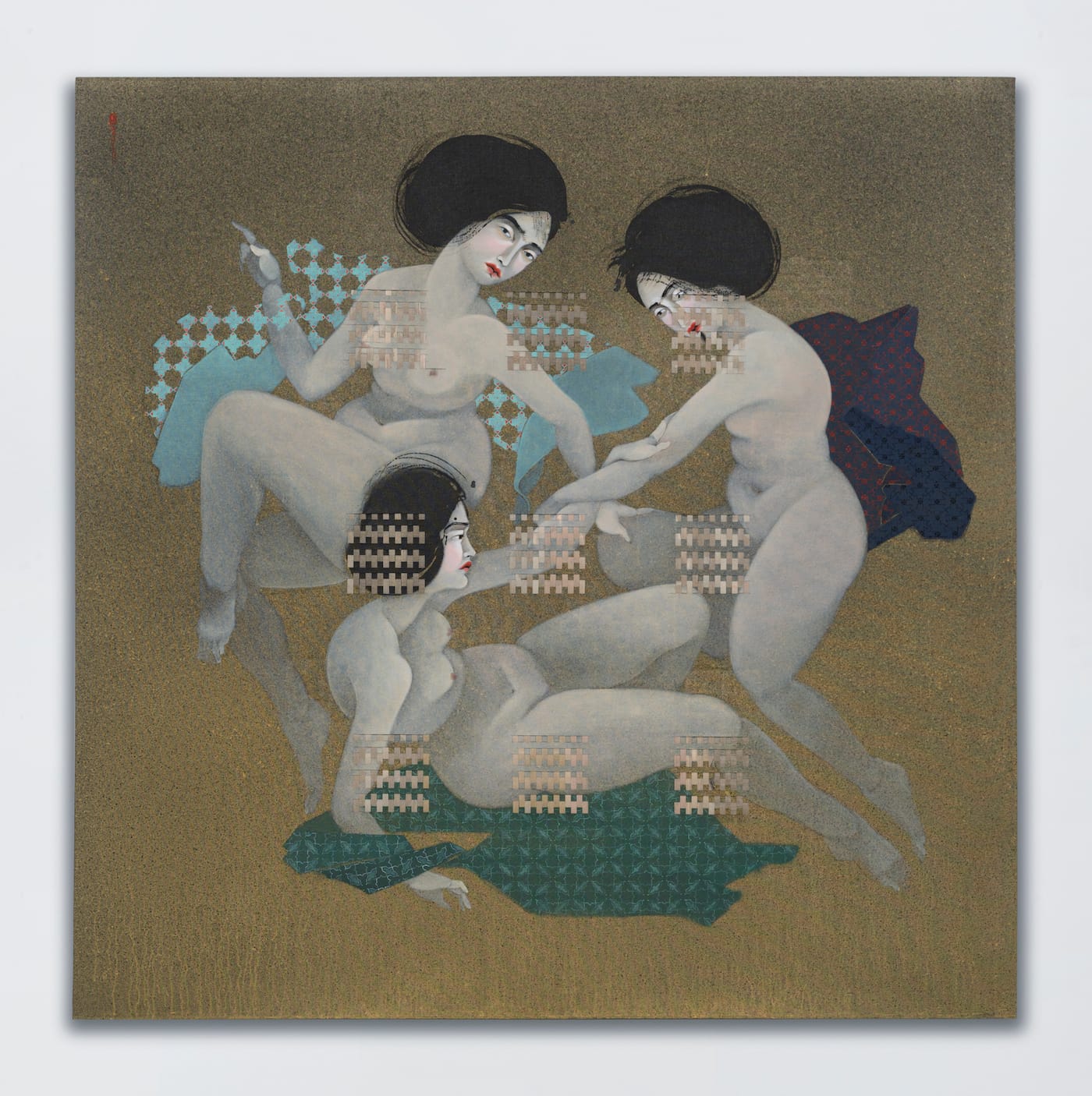 Kahraman assimilates divergent cross-cultural styles and genres, most notably from the Italian Renaissance and Japanese ukiyo-e prints. The artist, who trained as a graphic designer, confirmed in an interview that a four-year period spent in Italy exposed her to the idealized representations of womanhood by the likes of Botticelli. Later, however, she tells me, it dawned on her that these depictions were “colonized” by the male, Eurocentric gaze, which led her to critique power-hegemonies.