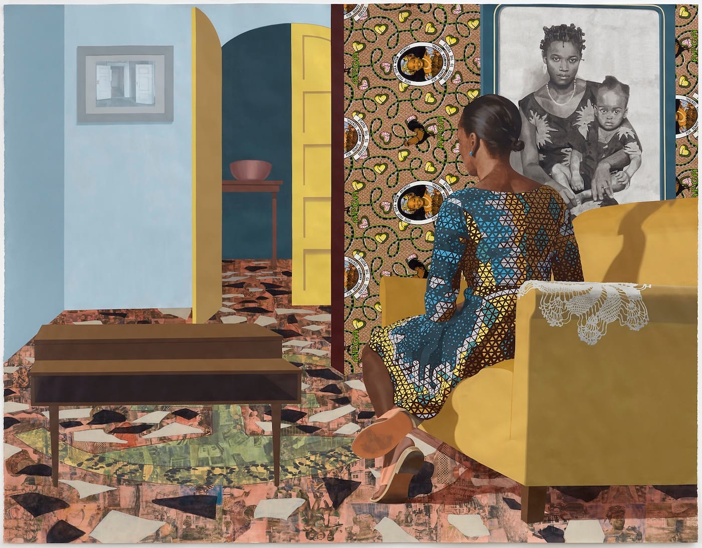 Blending photo transfers, drawing, patterned fabrics, and traditional painting techniques, the works of Njideka Akunyili Crosby reflect her layered personal history. Born in Nigeria, the artist now resides in Los Angeles, and has spent roughly half her life in the US since moving to Philadelphia at age 16. In her large-scale, visually dense pantings, African textiles, family photos, images from popular media, and architectural elements provide the framework for evocative scenes of contemporary black life.