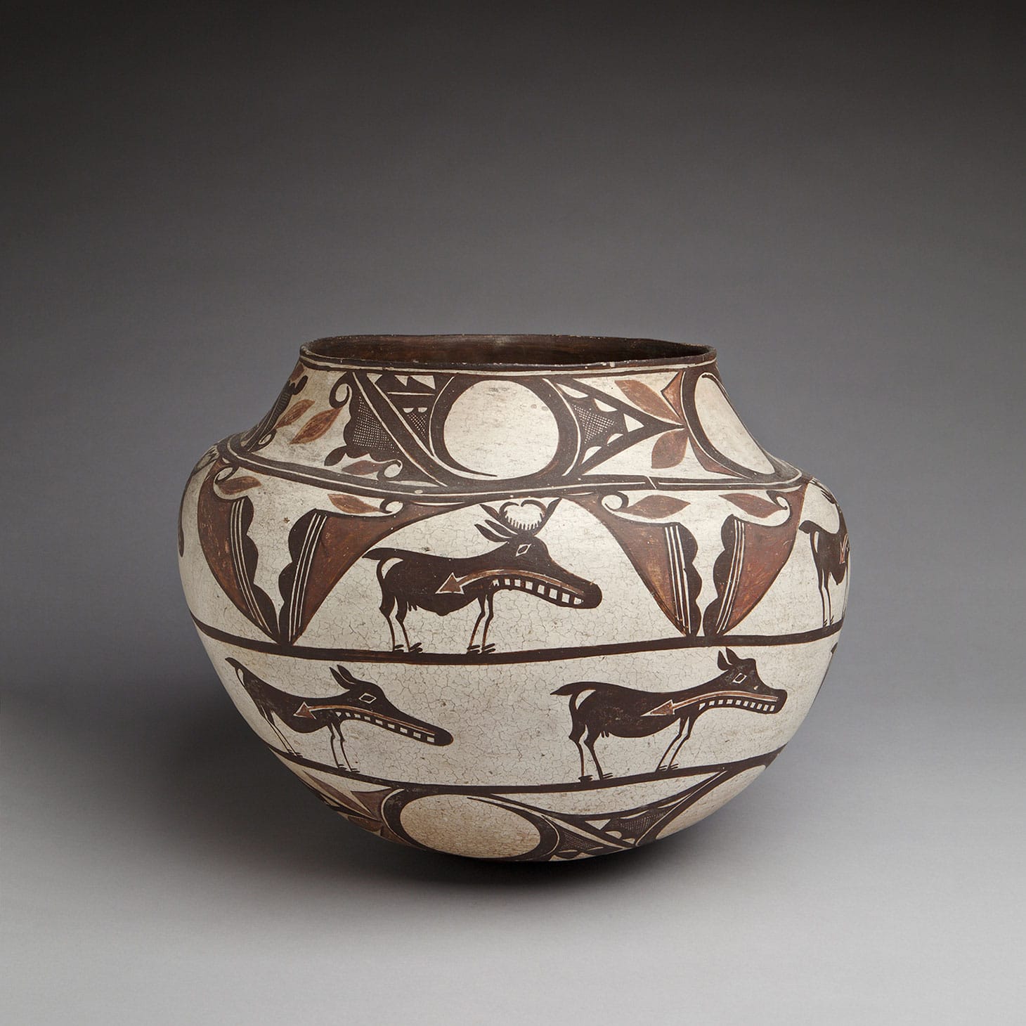 While clay and pottery have unquestionable links to women within Indigenous cultural practice, the expansiveness of gender is more clearly recognized within these communities. The Native concept of gender is configured much differently than biologically focused structures found in the West. Often, in the framing of artistic production of pre- and post-colonial work that is not rooted in the West, artists with gender identities that do not fit within a binary or linear framework are either lumped into the category of “woman” without distinction, or disregarded. The artist Arroh-a-och is described as k’u kweemu, or “like a woman and sister/brother” by Laguna community member Max Early and utilized she/her/hers pronouns and Laguna female gender words. Though little is known about the artist, Arroh-a-och, her “Storage Jar” is widely recognized as a signature piece of Pueblo pottery.
