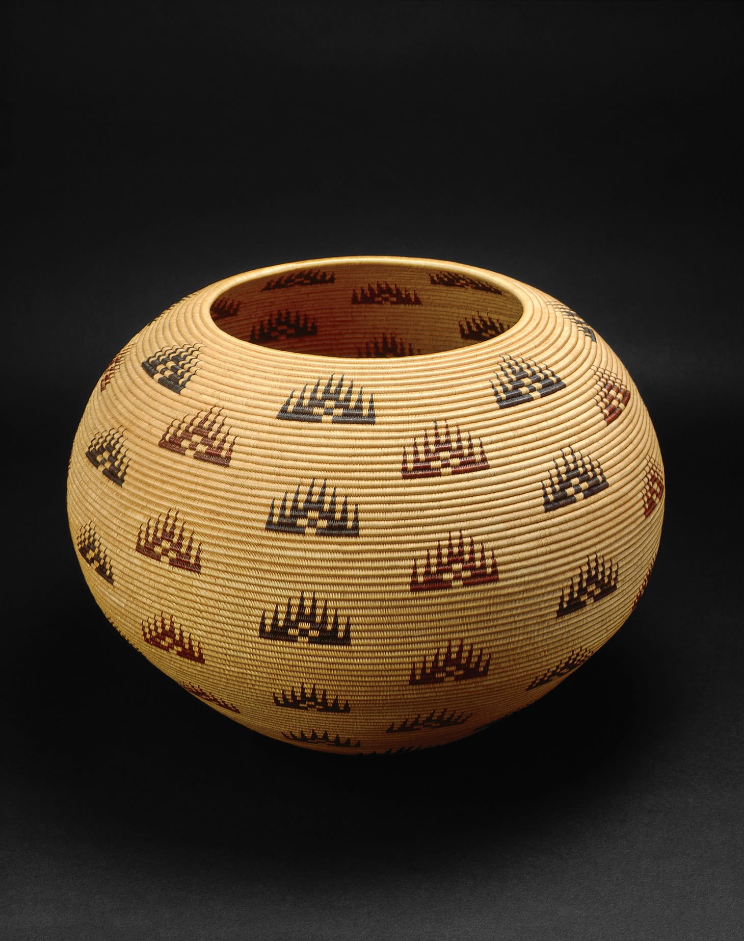 The impressive 343-page exhibition catalogue further contextualizes the exhibition. It includes scholarly articles and personal essays from members of their advisory board and artists with work in the exhibition. In their essay, “Encircles Everything: A Transformative History of Native Women Arts,” Janet Catherine Berlo, Professor of Art History at the University of Rochester and Ruth B. Phillips, Professor of Art History at Carleton University in Ottawa, recall Abe and Amy Cohn as major players in the colonization of Washoe baskets. Their intent was to collaborate, but instead the Cohns exploited the basket weaving artist Louisa Keyser by giving her the name “Dat-so-la Lee”, making her fame a distraction from the broader community of basket weavers. Keyser’s “Beacon Lights Basket” (1904) is representative of the artist’s signature degikup style — the rounded curve of the baskets is formed through a meticulous style of taut weaving, resembling rows of corn. Washoe baskets were known for their shape and the ability to hold water. According to Berlo and Phillips, “[the Cohns’] propagandistic misinformation has until recently obscured the artists’ greatest achievements in providing a critical economic and artistic resource for their communities at a time of cultural upheaval so great that it threatened their very survival.”