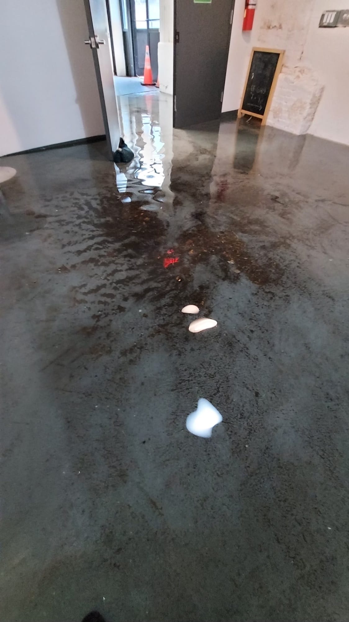 On Saturday afternoon, a clean-up team was mopping up the large puddles of remaining water and collecting water-logged artwork and materials to add to a heaping trash pile outside.