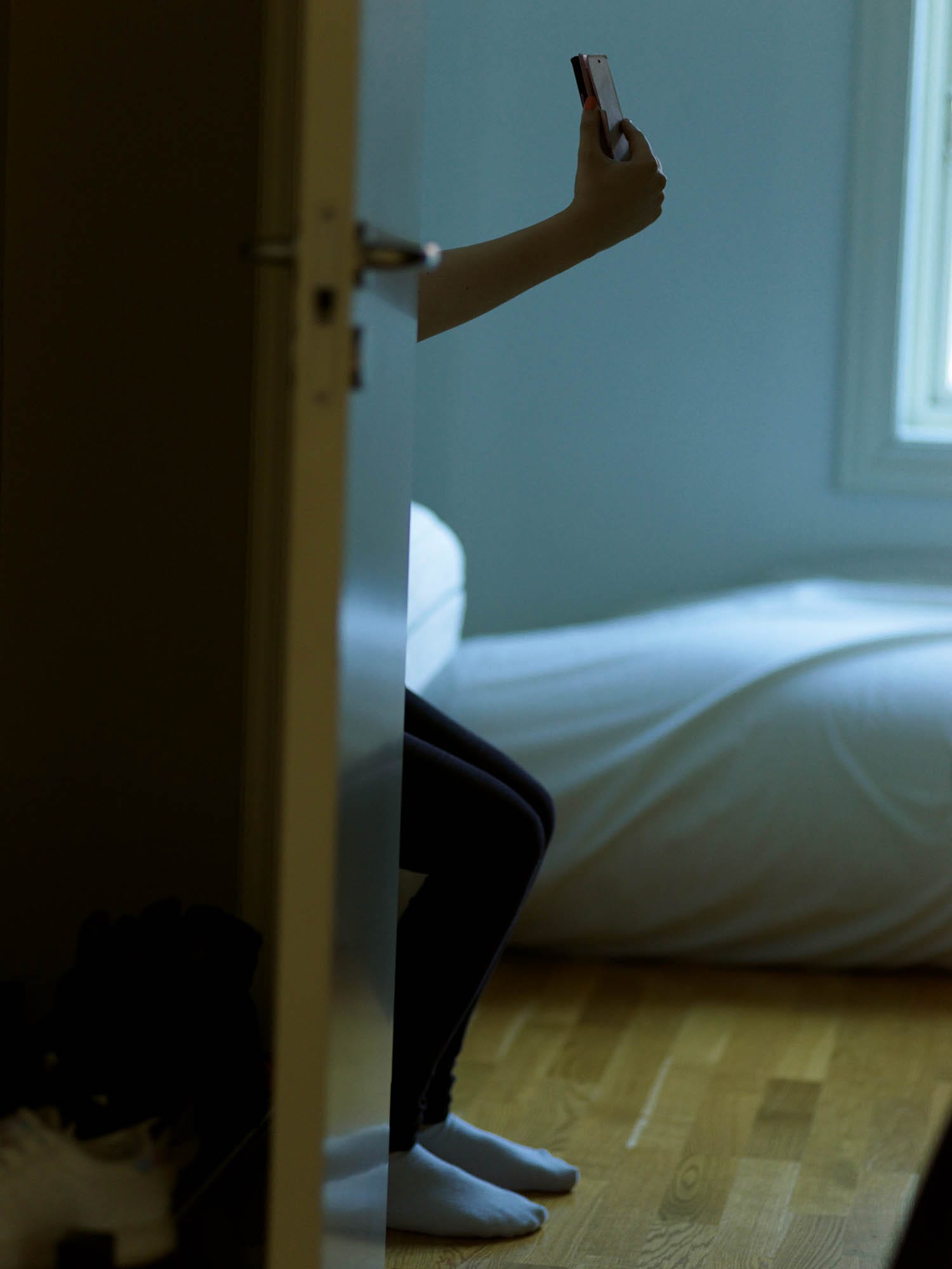 In a series of photos, Serck-Hanssen captures Hedda as she examines parts of her body with hand mirrors and her phone before and after surgical procedures. These intimate confrontations, and their later synthesis in Hedda’s posed but frank selfies, are not just signposts along Hedda’s history. They also point to the ways we define ourselves in the 21st century, where asserting ourselves aspirationally through social media is a constant occupation.