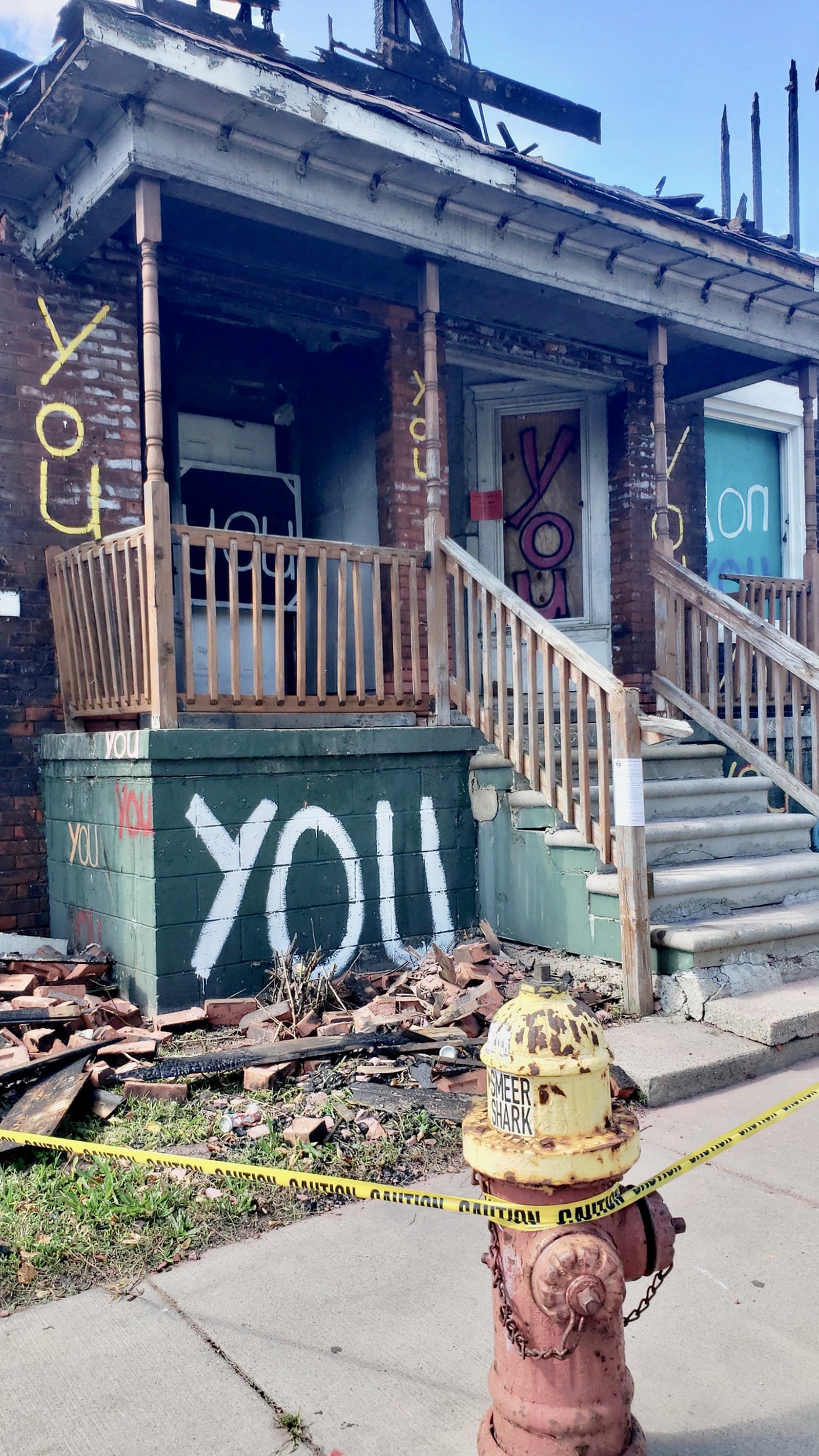 Perhaps someone felt he wasn’t working fast enough. Fire struck again early on Monday, September 23, this time engulfing the upper floor of the “You House” — permanently destroying the last remaining house that flanked the project’s eastward-facing boundary of Mt. Elliott St. Firefighters were quick on the scene, but delayed from doing more than monitoring the blaze due to a succession of five non-working fire hydrants — possibly the result of water main repairs ongoing on the East side.