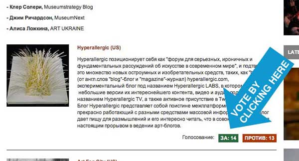 Hi Hyperallergic fans! Hyperallergic is in the running for a blogging award in Russia worth thousands of dollars and WE NEED YOUR HELP! Click here to head straight to the poll [http://aifaar.com/index.php?option=com_content&view=category&layout=blog&id=62&Itemid=73&lang=en] (it's In Russian) and cli