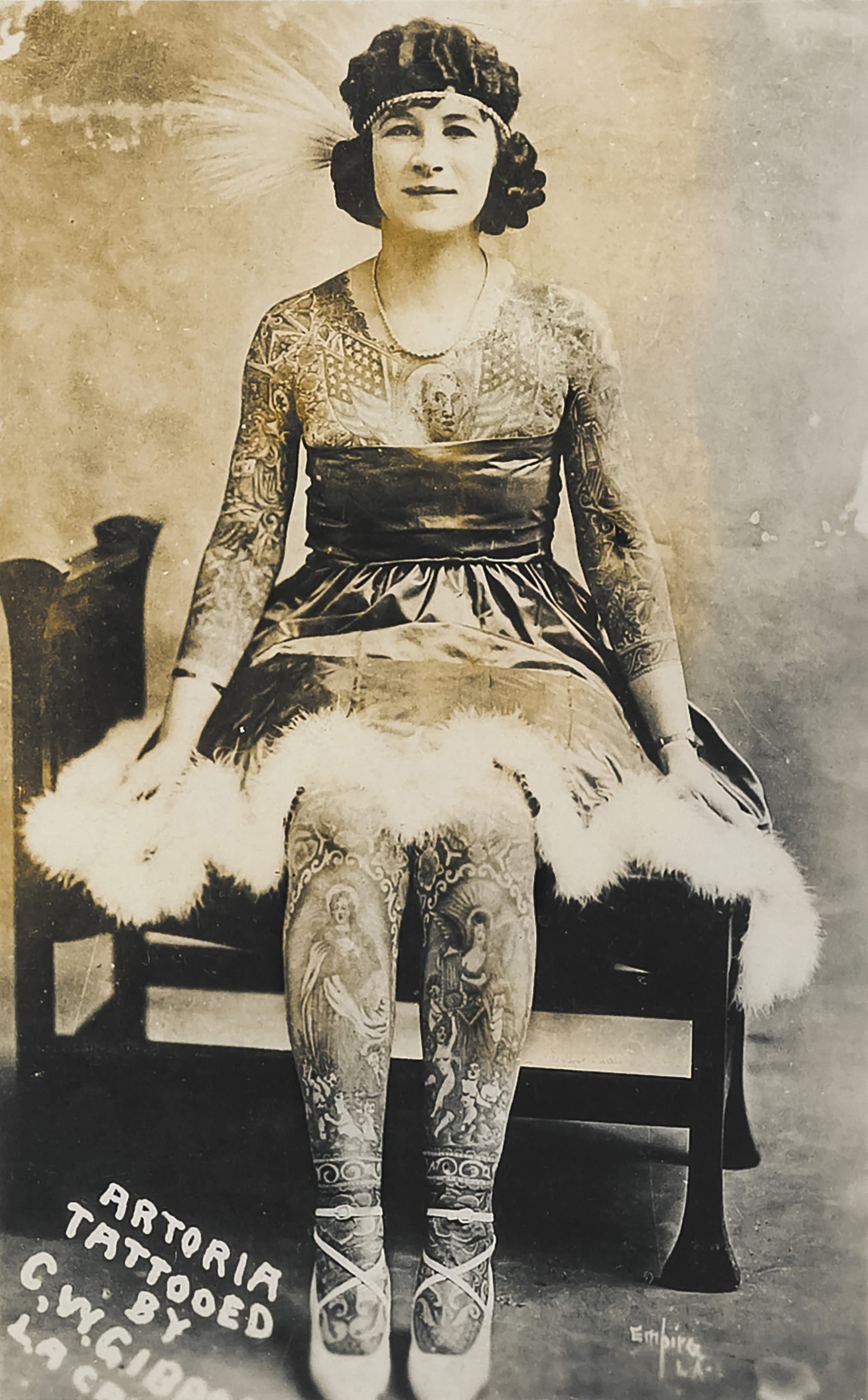 Famous American tattooed woman Artoria Gibbons, ca. 1920s, one of the longest-performing tattooed ladies ever, who worked the circus sideshows, dime museums, and carnivals until 1981 (© Courtesy of the Schiffmacher Tattoo Heritage; image courtesy Taschen, Cologne, Germany)