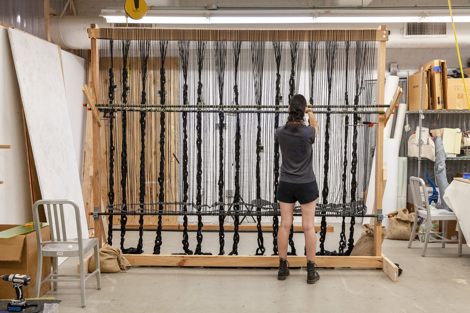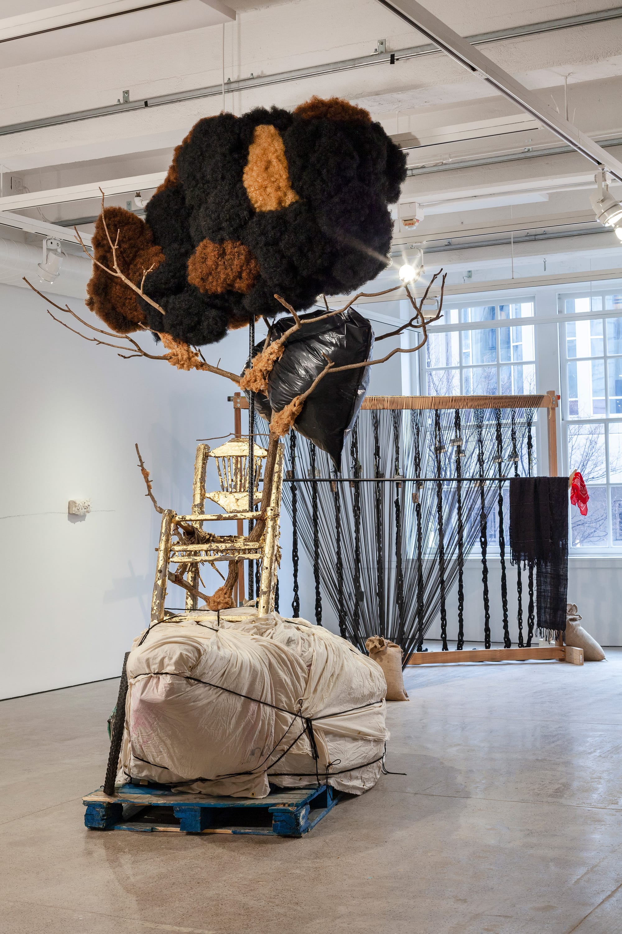 A large boat-like construction wrapped in canvas, atop a painted blue pallet, greets a visitor upon disembarking from the elevator at FWM. Atop the hulking apparition is a gold-painted chair with shredded twigs, and from it rises a tree from that hangs black plastic bags and three large mounds of Afro hair in three colors (black, brown, and red). Ropes extend from the rear, like jet sprays, to connect to an enormous wooden loom from which are suspended more ropes, and from each dangles a metal door hinge and plastic water bottles filled with pebbles.