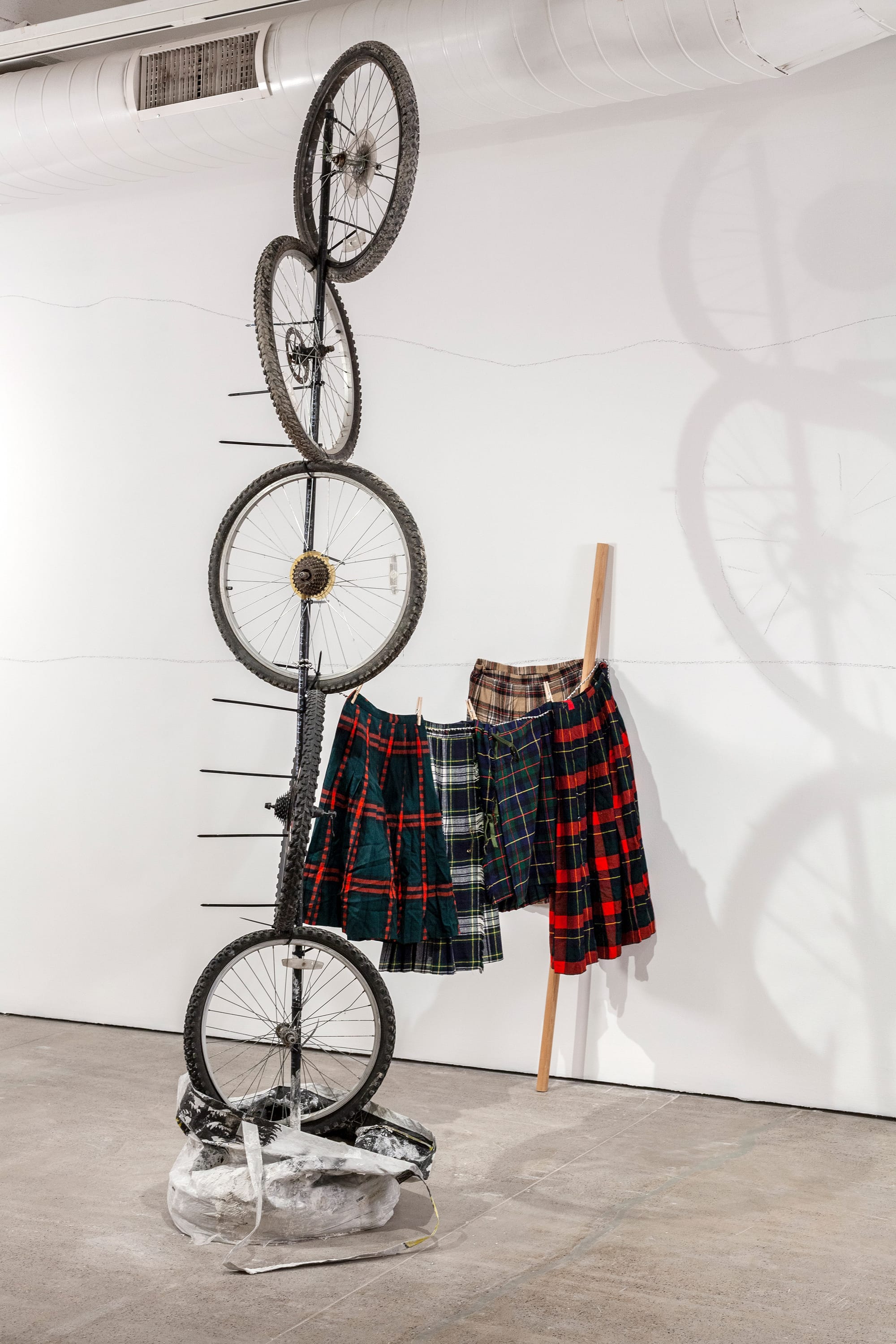 Taylor creates tartan with neon lights, wraps boxes with tartan fabric, and on a grommeted tarp attached with blond and Afro hair, he meditates on the associations of tartan and Tarzan. Using a loom custom-built for him by the FWM, Taylor created a black-on-black tartan cloth. In another work, in which a large tarp painted red is draped against the wall, tartan is deconstructed, as torn strips of plaid cascade alongside bungee cord and a bicycle wheel. Elsewhere, a totem of bicycle wheels is alongside a clothesline of tartan kilts.