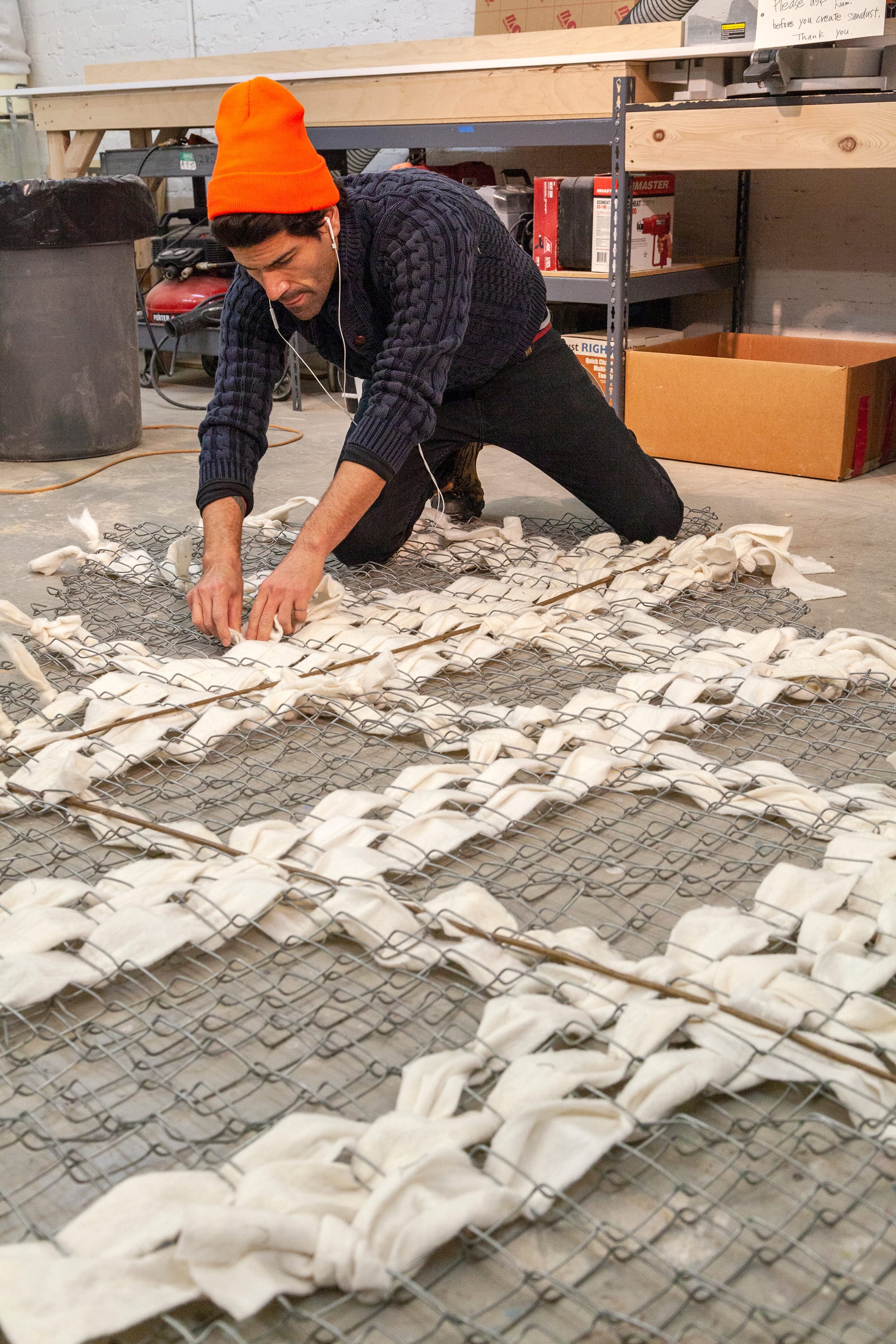 It is Taylor's first foray into working with fabric. A chain link fence is woven with golden fleece, becoming a plaid pattern. Using warp and weft (horizontal and vertical) — the pattern of crisscrossed cloth, Taylor looks at how people, like materials, are held together, separated, and categorized socially and systematically. This pattern, called tartan, is traditionally associated with Scottish clans and families.
