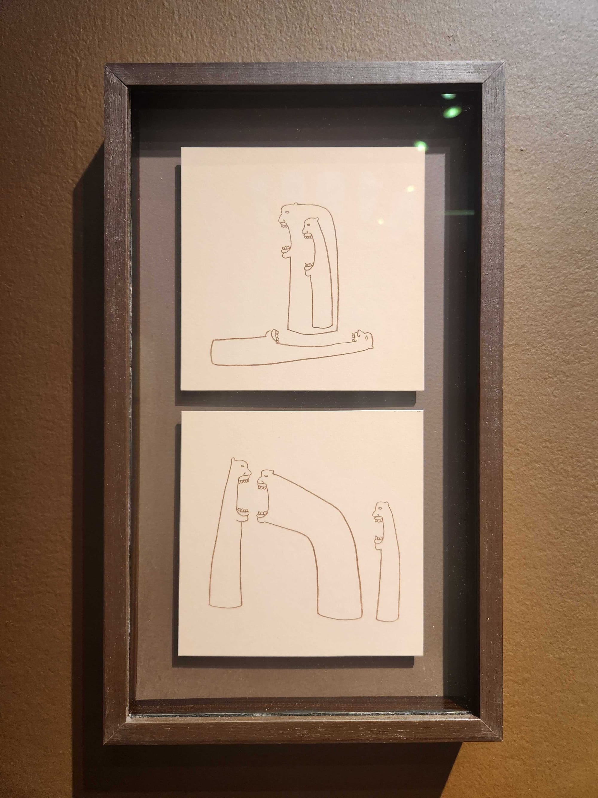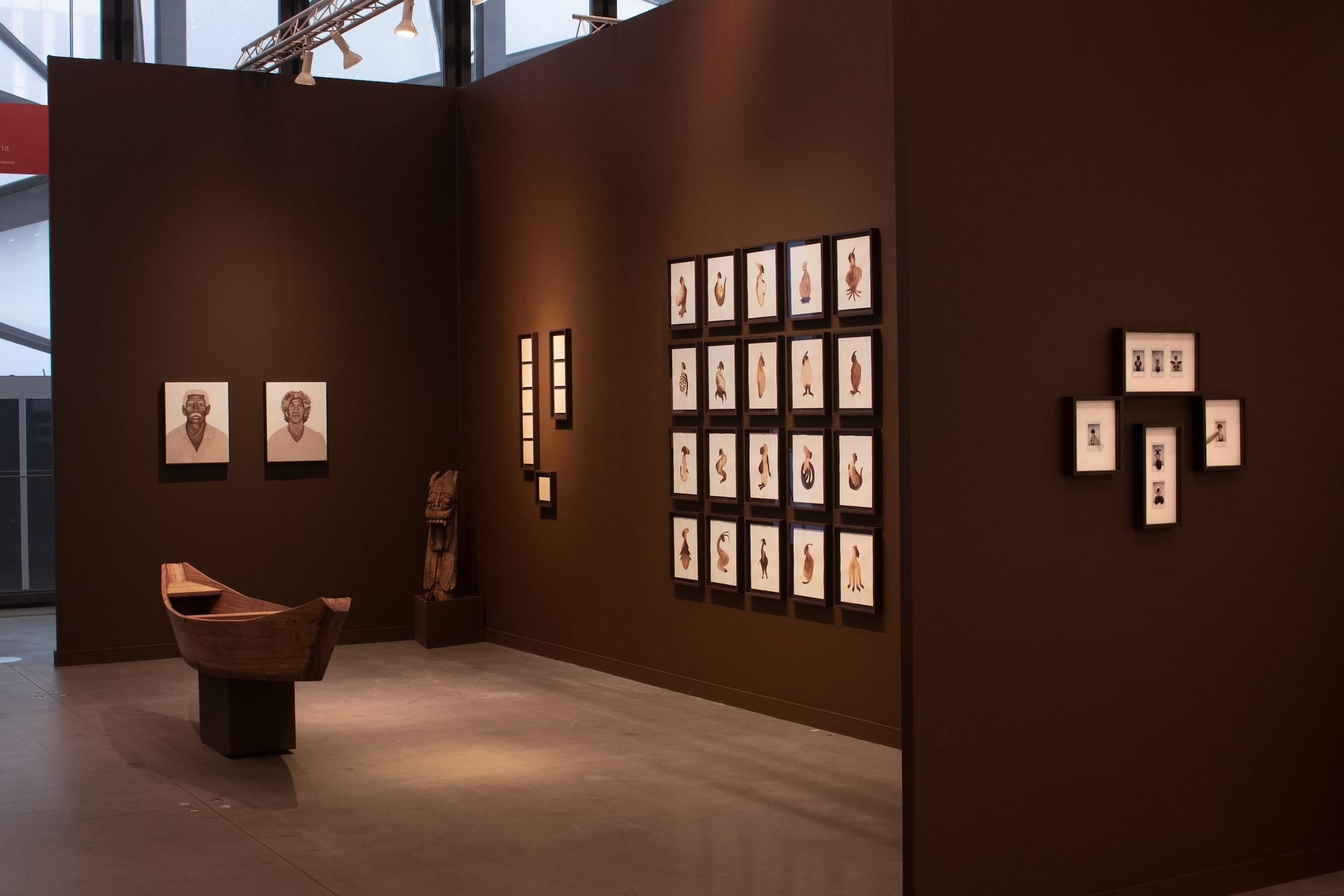 Nascimento's practice is profoundly family-oriented. Coming from a line of woodworkers, the artist anchored the booth with a carved boat he completed with his father and included a wooden carranca, a Brazilian carved figurehead with bared teeth meant to protect rivermen from nefarious spirits, that he unearthed from his family property. The physical carranca was accompanied by nascimento's brown-pencil drawings of carrancas overpowering each other and swallowing each other up, which he told me was the way they reproduce.