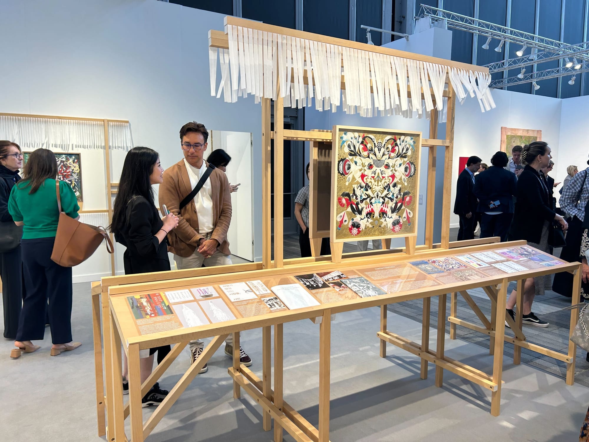 Kukje Gallery's museum-style exhibition focused on sacred papercutting traditions across East Asian cultures through a solo presentation of Haegue Yang's Mesmerizing Mesh (2021–). Holly Hendry's half-surgical, half-OfficeMax wall hangings at the Stephen Friedman booth caught my eye, though I can't shake the latter's resemblance to Matthew Ronay's sweeping sculpture showcased at the Casey Kaplan booth last year.
