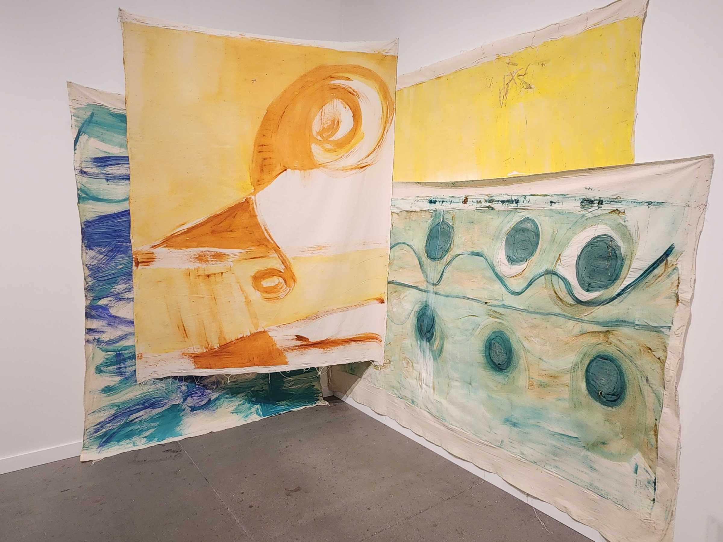 Across the aisle at the Esther Schipper booth, the twirling, colorful 35mm film rolls in Rosa Barba's "Color Rhymes" (2023) complemented the revolving poodle but certainly offered more visual excitement, especially to the infant beside me who tried to trace the film rolls with her tiny little index finger before turning and snatching her dad's nose instead. Then I came across Marepe's clay pots displayed on the floor at Anton Kern Gallery booth, which I would like to think could be me and my friends if we were cunty ceramics.