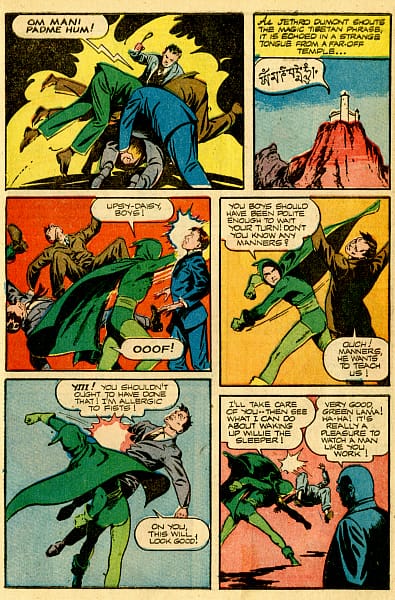 After acquiring his mystical skills, including holding back bullets, in Tibet, the Green Lama goes back to New York City to fight evil. He changes into the Green Lama by reciting a famous Tibetan mantra. “When he speaks out this mantra, it echoes to Tibet and he transforms into the Green Lama,” Brauen said. “When he’s done his good work, he reverses the mantra and transforms again.”