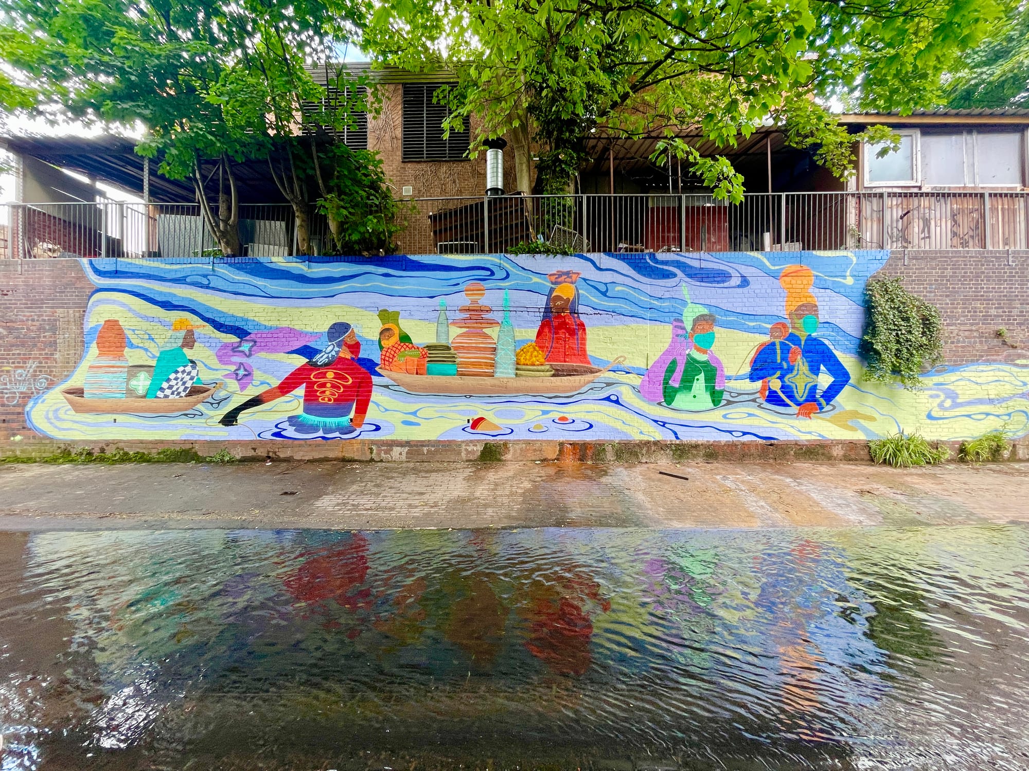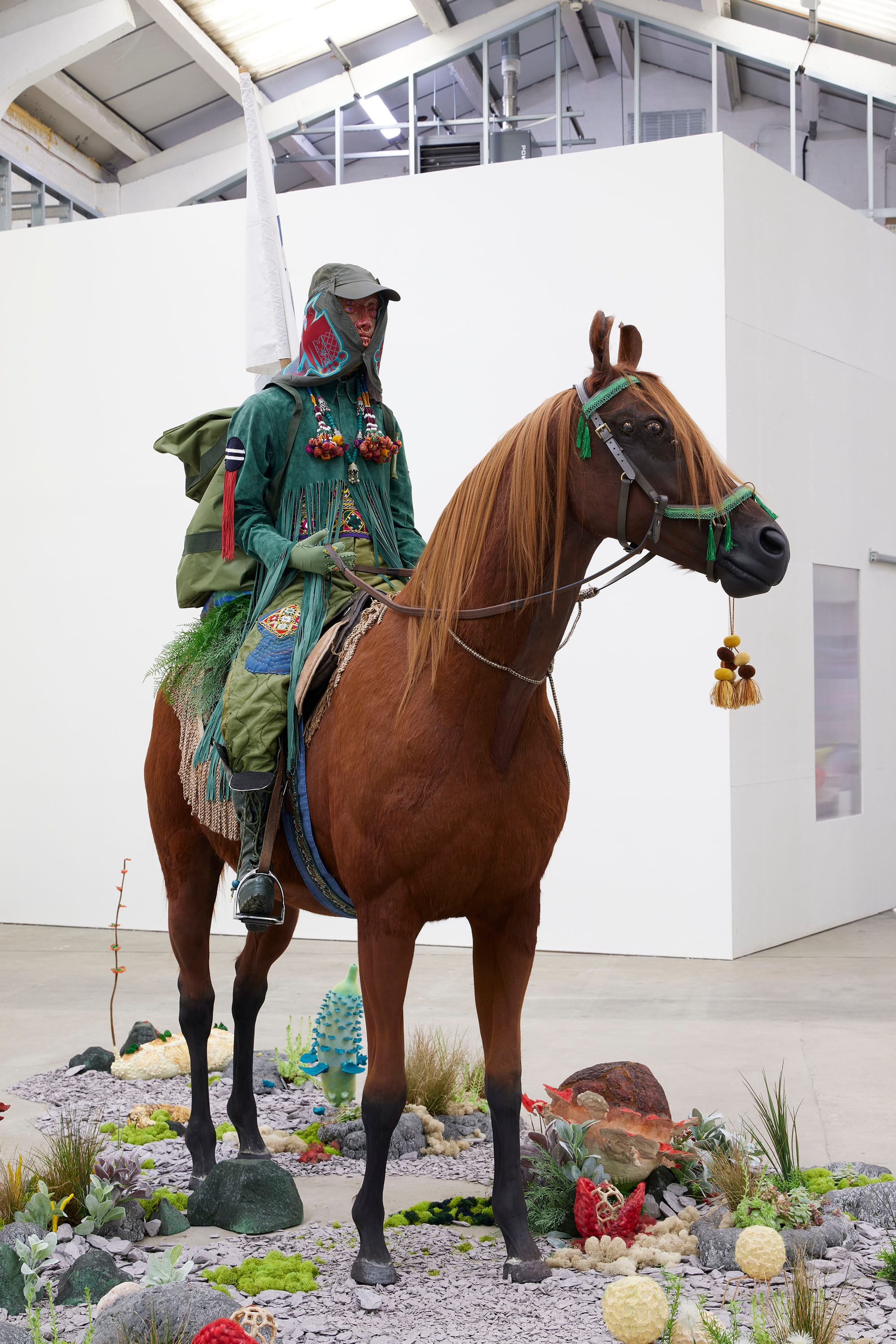 A 15-minute walk from Victoria Square, another commission as part of the Birmingham 2022 Festival adopts a different, more directly anti-colonial approach to imperial monumentality. In the gallery at Eastside Projects in Digbeth, “A Starry-Eyed Subspecies” (2022) is a full-size equestrian statue made from resin, hair, moss, leather, brass, beads, and foam. It is the centerpiece of Rajni Perera’s exhibition Traveller. Born in Sri Lanka and based in Toronto, Perera’s work imagines the world that comes after ecological collapse and the end of white suprematism. In this near future, the legacy world-views of extractivist capitalist-colonialism fail. Cultural rather than political answers are found for a damaged, mutated, poisoned, overheated world. The figure of the climate refugee displaces that of the Western explorer. The migrant unseats the colonizer. The Traveller rides a “post-horse” and is surrounded by hybrid pollution-wear masks, a “truth-ring,” and images of floods, journeys, and ancestors. With the Birmingham artist Annatomix, Perera also made a public mural on the bank of the River Rea in Highgate, one of the most deprived areas of Birmingham, depicting figures taking their possessions by boat to a place of safety.