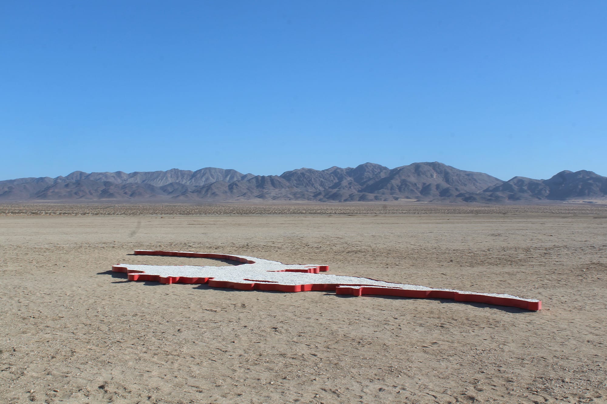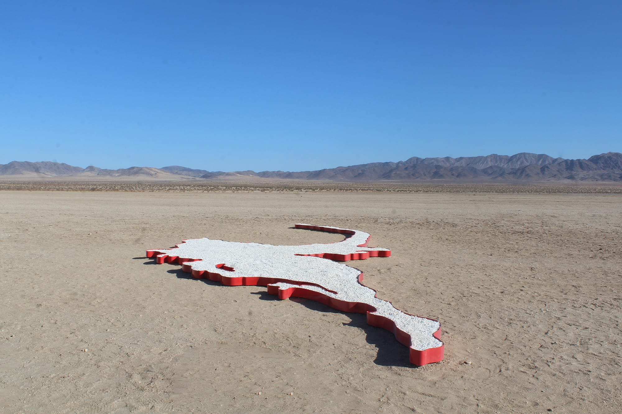 Alice Channer’s “Rockpool,” by contrast, highlights the ecological harm colonialism has brought to delicate environments. Her 60-foot-long sculpture takes the form of the 2010 British Petroleum Deepwater Horizon oil spill, which leaked 134 million gallons of oil into the Gulf of Mexico and contaminated 1,300 miles of shoreline. Instead of filling the piece with black substance, Channer instead colors it with bright white salt, a direct reference to the terrain in which it is embedded. “Rockpool” is nestled near Wonder Valley’s salt mines, where the mineral is then sent to fracking sites, tying the dry desert to the waters of the gulf shores.