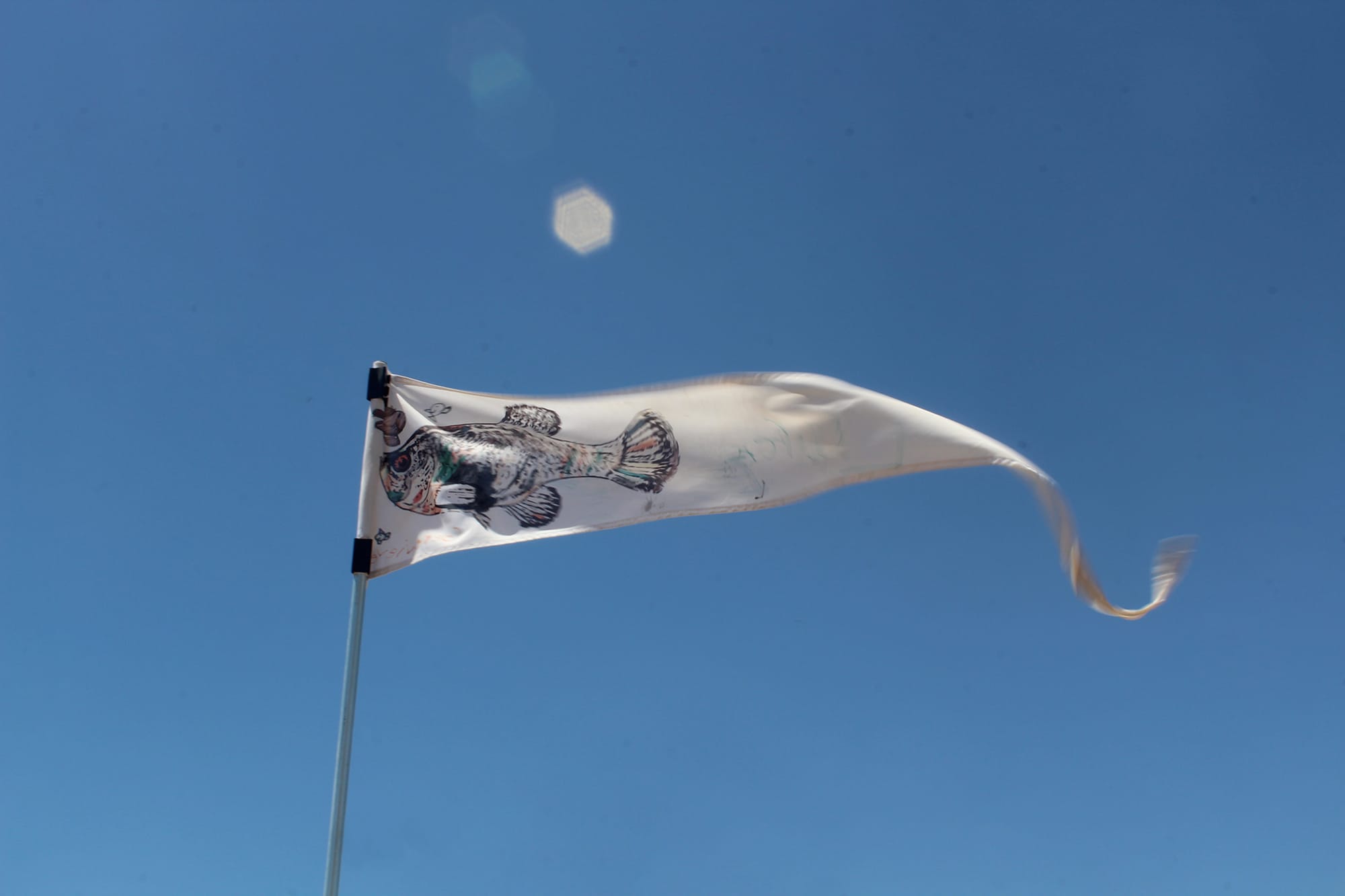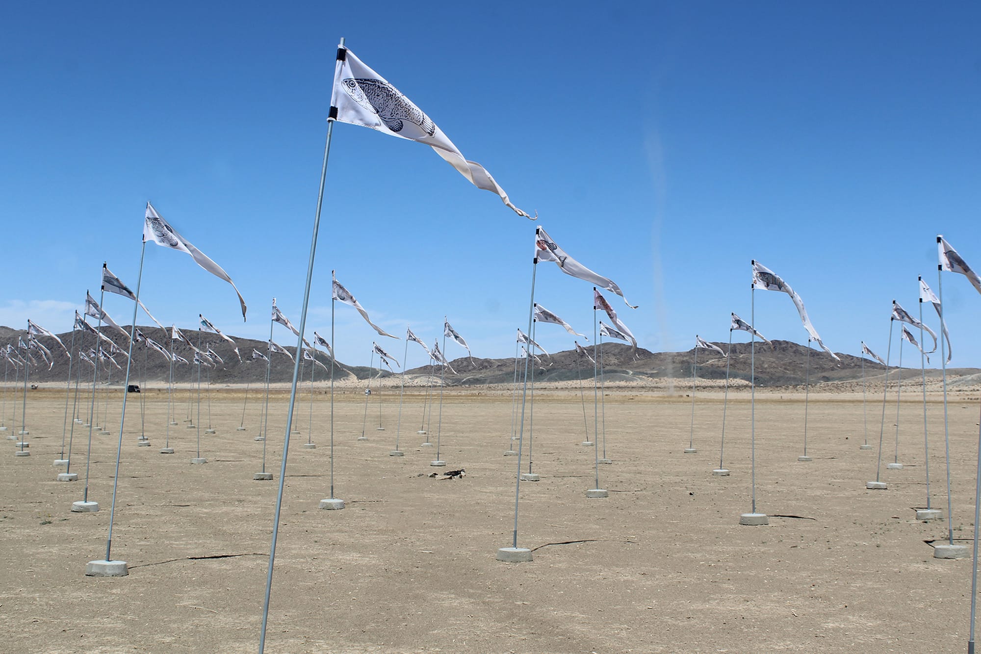 In Gerald Clarke’s “Earth Memory,” hundreds of flags populate the Sunfair Lake drybed. On each flag is an image of a fish, representing the species that swam on this now sandy terrain millennia ago. They whip in the wind against a backdrop of mountains and the roaring of dirt bikes. Clarke’s work represents the natural casualties of geological change, the world before human intervention.