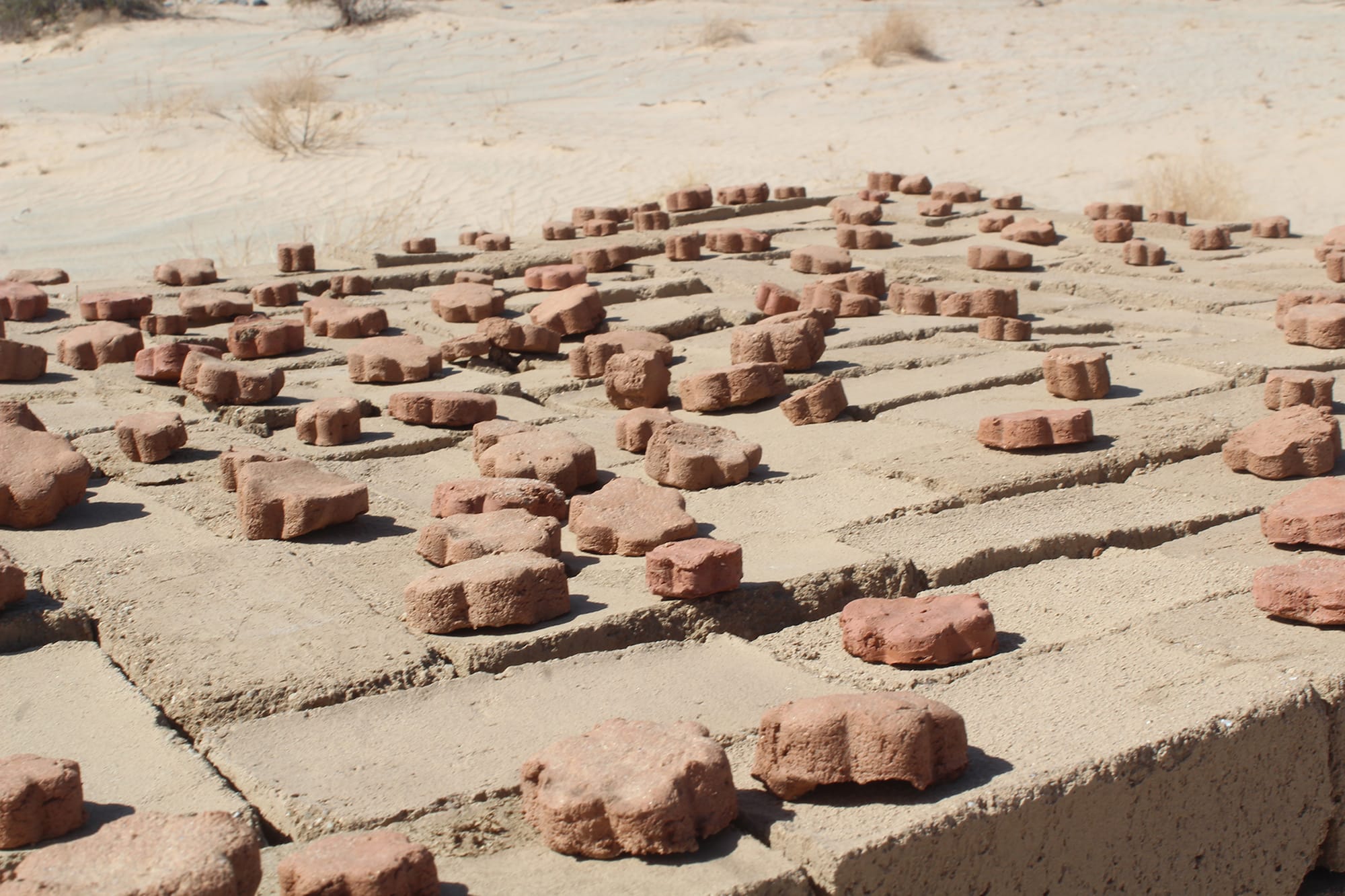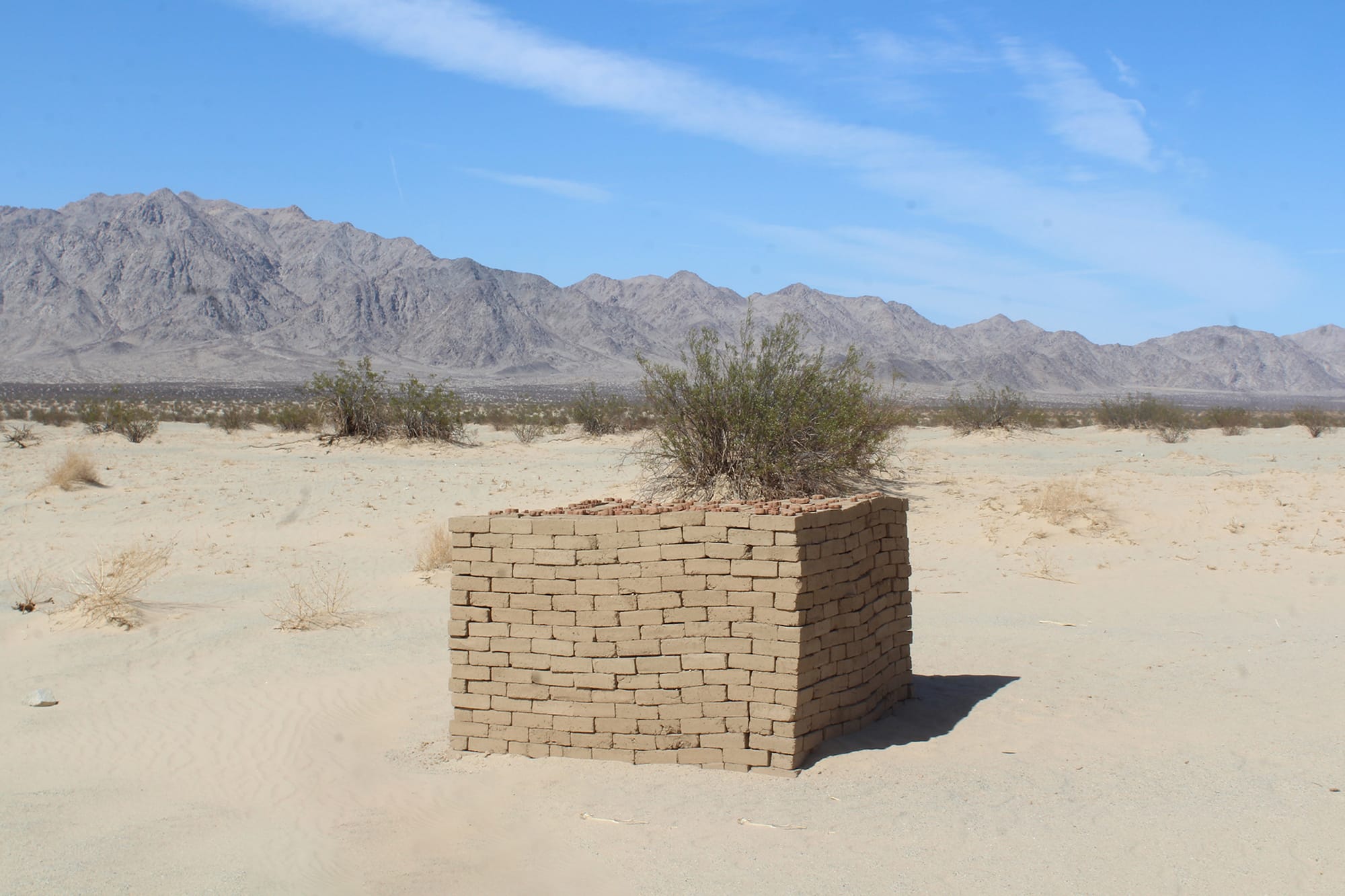 After a few minutes of stomping through sand and scanning the brush for rattlesnakes, I arrive at two brick structures that have begun to sink into the dust that blows across the Mojave Desert at night. Bopape’s contribution, “lerato le le golo (... la go holka bo kantle)” (all works 2022), is built from adobe bricks handmade by the local Joshua Tree community. They’re stacked unevenly, without any mortar to bind them. Some are perfectly smooth and others are hastily molded. On top of the bricks are smaller, flower-shaped clay forms that remind me of the stones my Jewish family leaves on gravesites — offerings to past generations, humans and wildlife, who once roamed the Mojave.