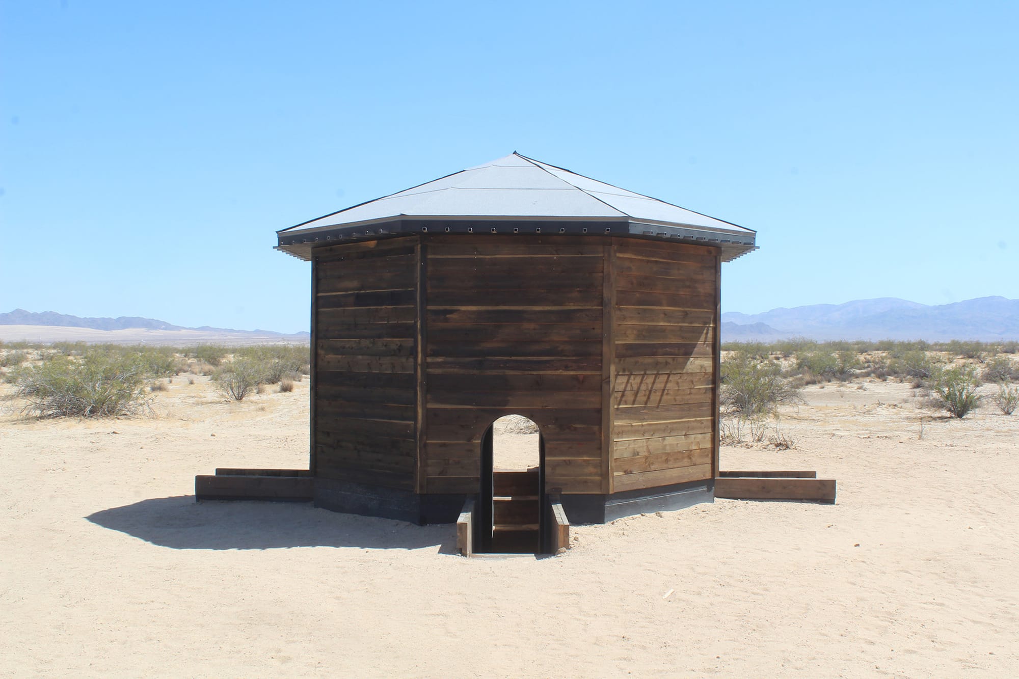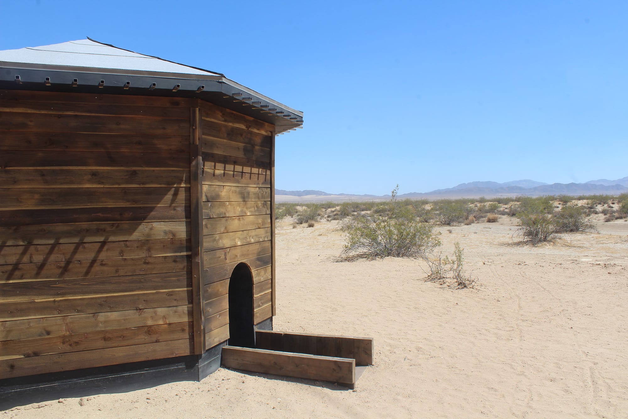 Other works in The Searchers focus on dwellings and the journeys taken to reach them. Kate Lee Short’s “Respite” appears as a simple wooden hut off a frontage road that runs parallel to Amboy Road — I drove past it twice, mistaking it for abandoned architecture before realizing it was an artwork. But “Respite” offers a pleasant surprise: Hidden steps lead a few feet down into a carved-out pit, where shade protects you from harsh heat. Four openings on each side allow the wind to rush through, creating humming sounds as the air flows in and out.