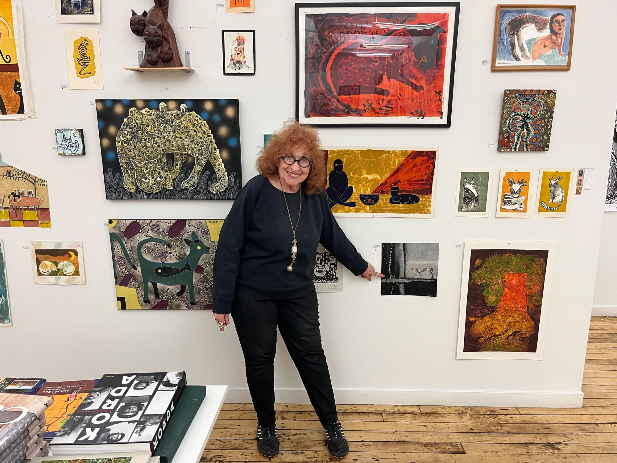 Down the hall, the Center for Cuban Studies was teeming with drawings, paintings, and wood works of cats on every spare surface for its exhibition Gatos Cubanos. Sandra Levinson, the nonprofit’s co-founder, brought more than 400 works from Cuba over several trips to the island.