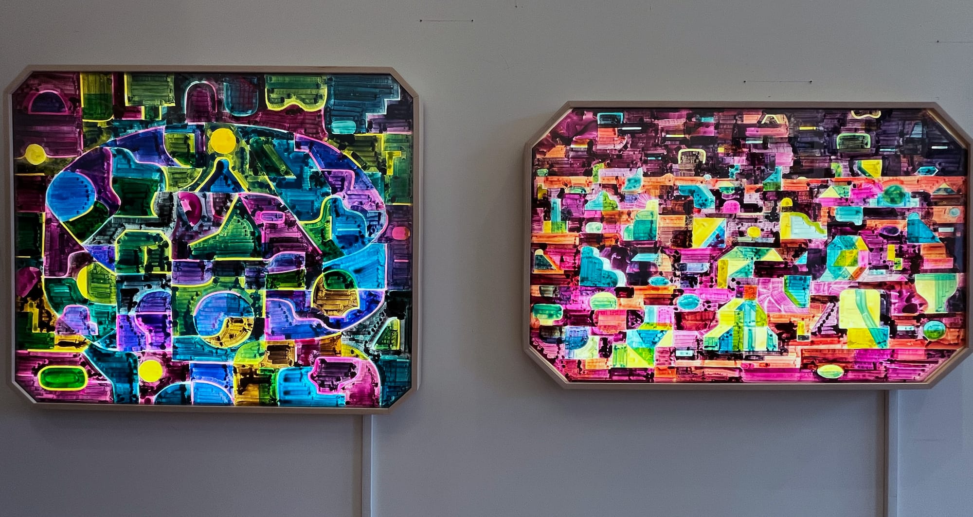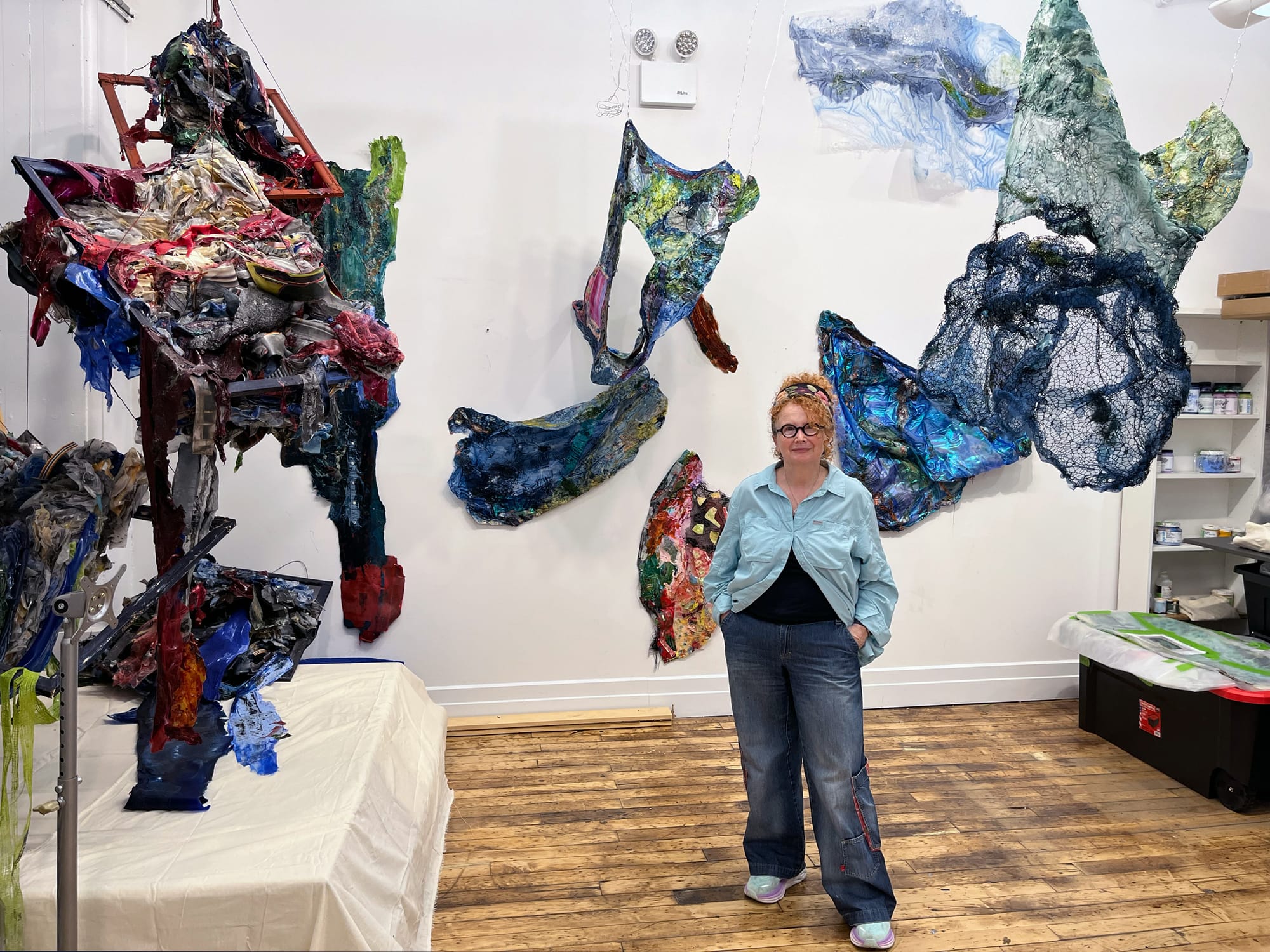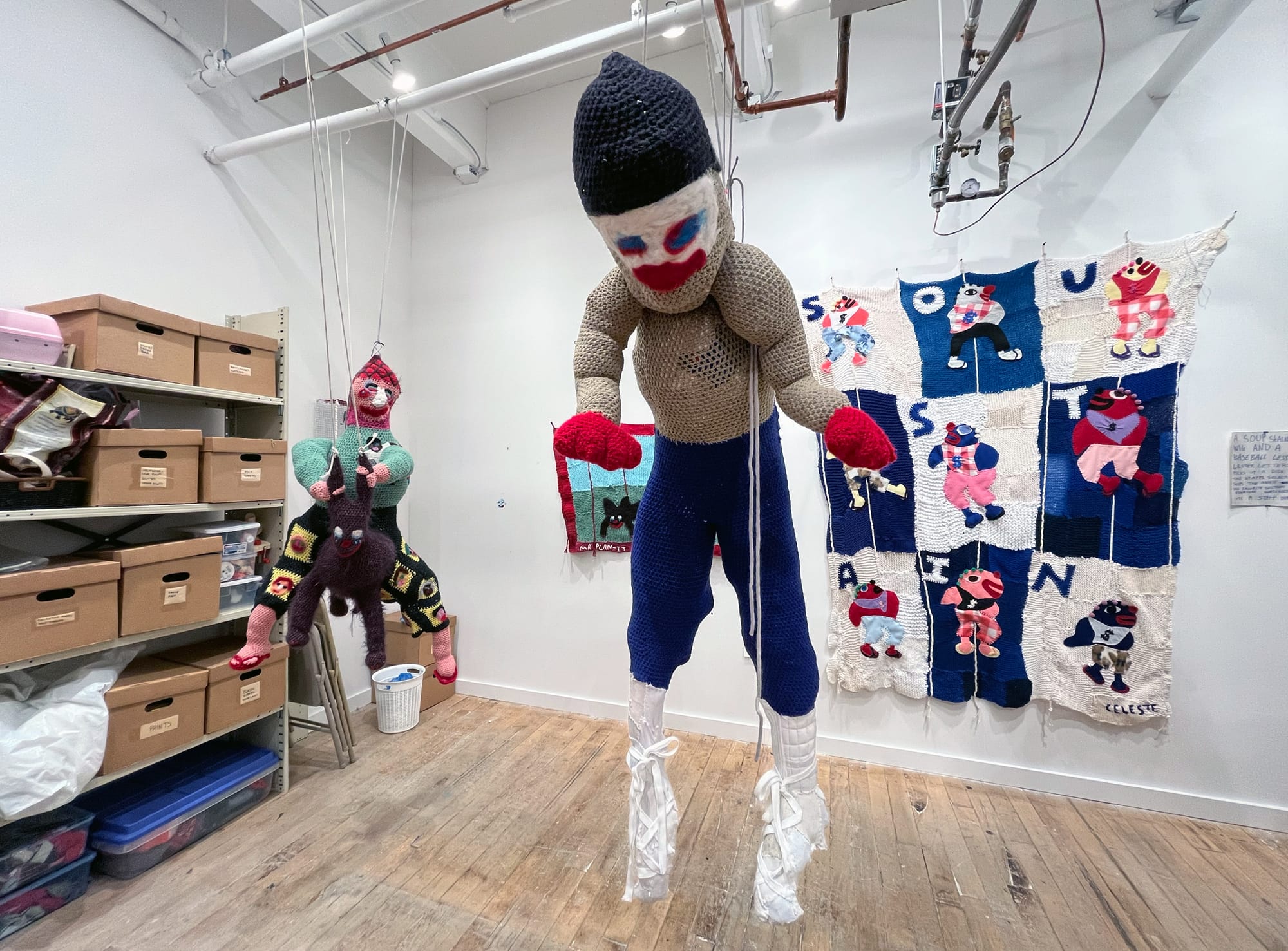 Crowds swarmed a warren of fourth-floor studios containing animator Dakota Gearhart’s psychedelic backdrop for her underwater variety show Life Touching Life (2024–ongoing), Celeste Diaz Falzone’s startling collection of fabric clowns, and Natalie Collette Wood’s earthy living sculptures.