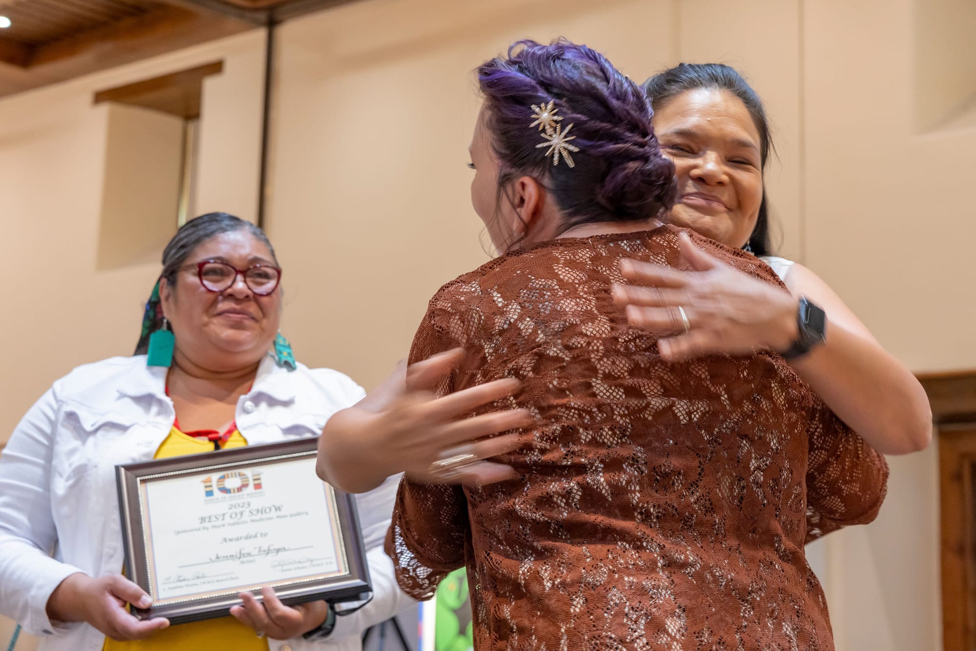 Veteran artist Jennifer Tafoya (Santa Clara Pueblo) is best known for her hand-coiled pottery. Her dinosaur-themed pot “Caught by Surprise” (2023) won her this year’s Best of Show (BOS) award ar the market. The hand-dug Santa Clara Clay vessel is playful in design and sophisticated in form, featuring a scene of a T-Rex hunting its prey in a dynamic and detailed tableau. Tafoya’s elaborate technique includes the application of natural ore colors and clay slips that she collects through natural sources.