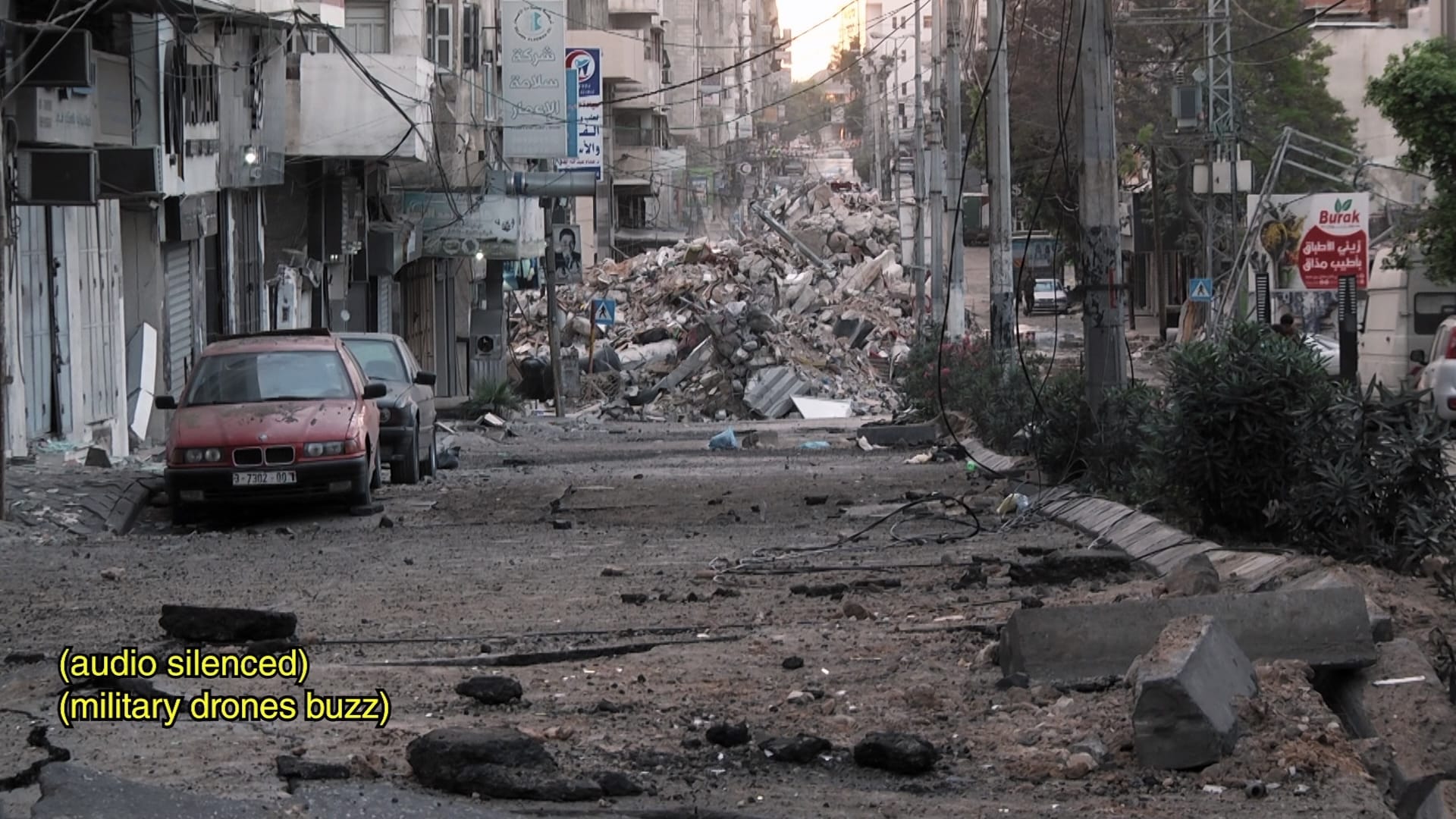 Palestinian artist Rehab Nazzal’s 16-minute documentary “Vibrations from Gaza” (2023) features interviews with several children from the Atfaluna Society for Deaf Children in Gaza. The sign-language film, underlaid by a constant military drone hum, captures the children’s memories of Israeli bombardments through various senses.
