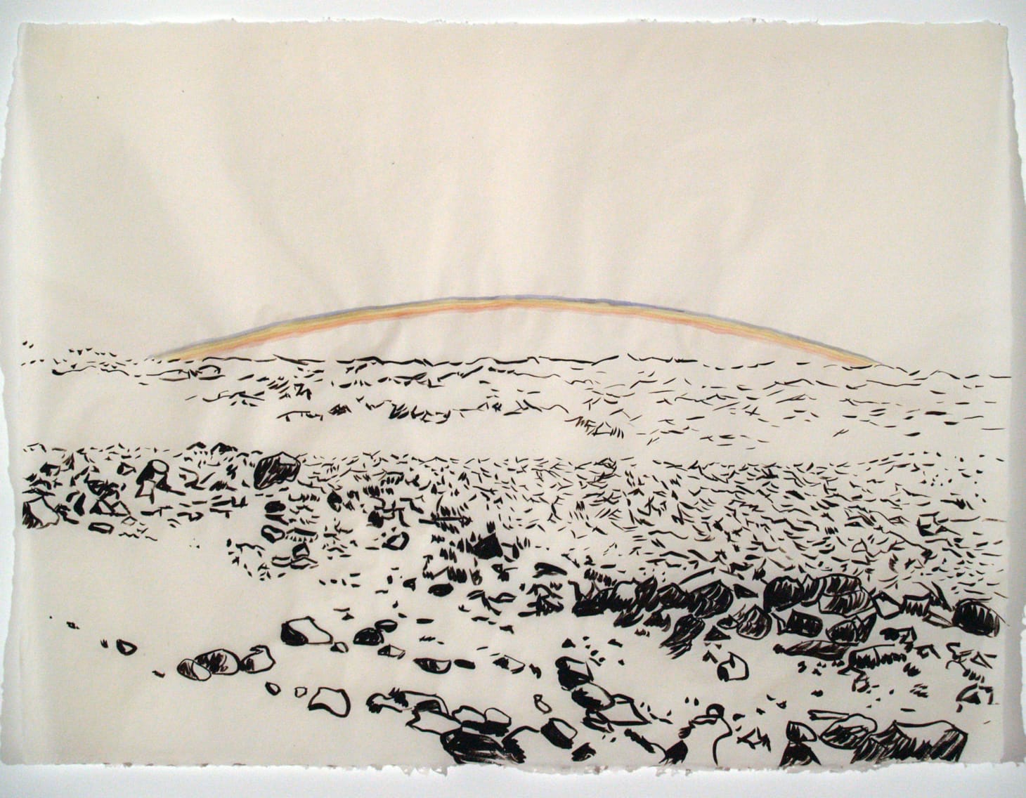 CLEVELAND, Oh. — When I recently walked into Abattoir Gallery for the first time, I was greeted with rainbows. Delicately drawn on tissue-thin Abaca paper, arcing over sparse landscapes, their buoyancy felt incongruous, mocking even. After all, I had just checked in with a masked attendant, who gestured to a table of amenities, including masks, sanitizer, and pre-packaged snacks. It occurred to me that I was also standing in a former meat-processing plant, having listened on the drive over to a podcast about outbreaks of COVID-19 at industrial meat plants elsewhere in the Midwest.
